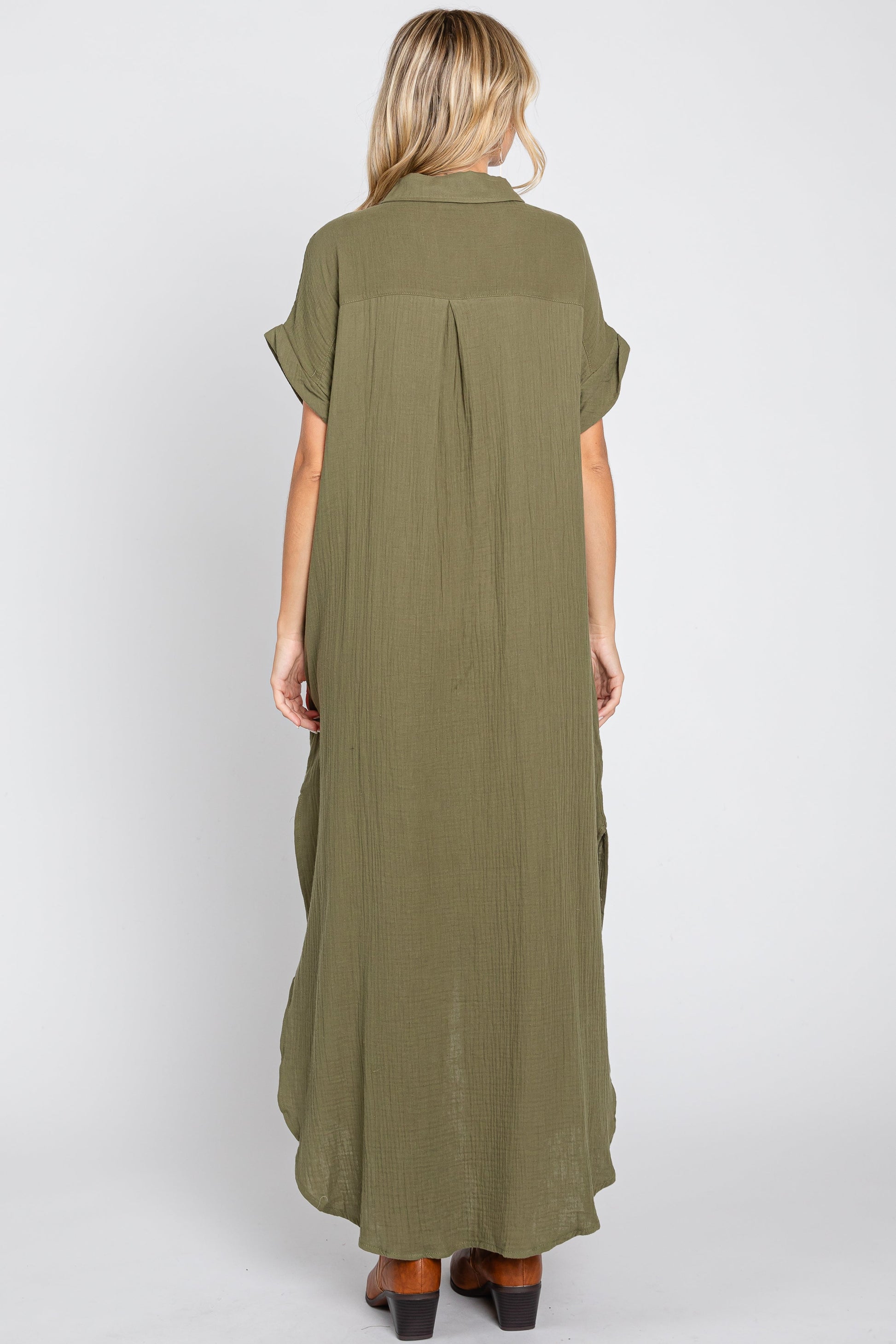 A solid short sleeve midi dress with collared neckline, front pocket detail, button down closure in front, hidden side pockets and rounded split hem.