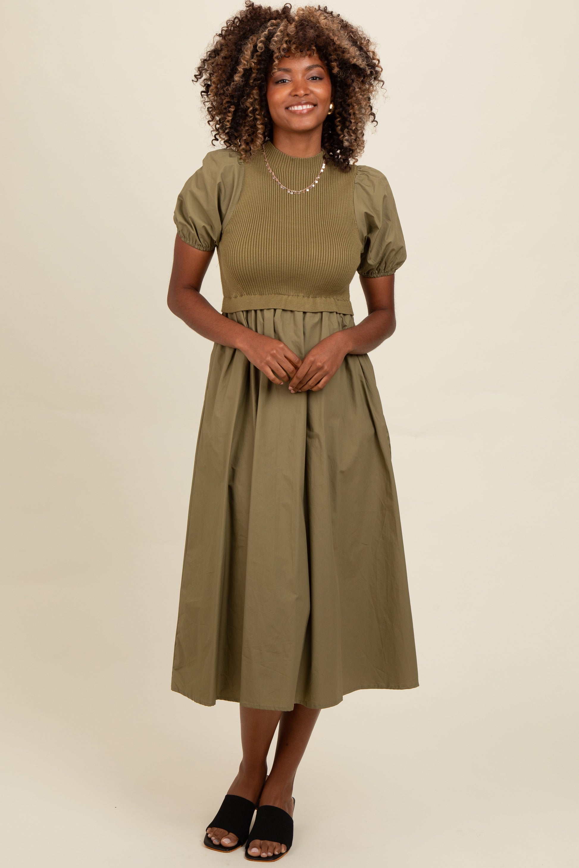 Elevate your style with our Olive Contrast Knit Bodice Midi Dress, featuring a chic combination of knit and woven fabrics. The fitted, ribbed knit bodice offers a flattering silhouette with a high neckline and puffed short sleeves that add a touch of vintage charm. The midi-length skirt flows gracefully from the waist, crafted from lightweight, breathable fabric for all-day comfort. Perfect for both casual outings and special occasions, this dress pairs effortlessly with sandals or heels. Make a statement in timeless olive green—versatile, stylish, and designed to turn heads wherever you go. Available in multiple sizes.