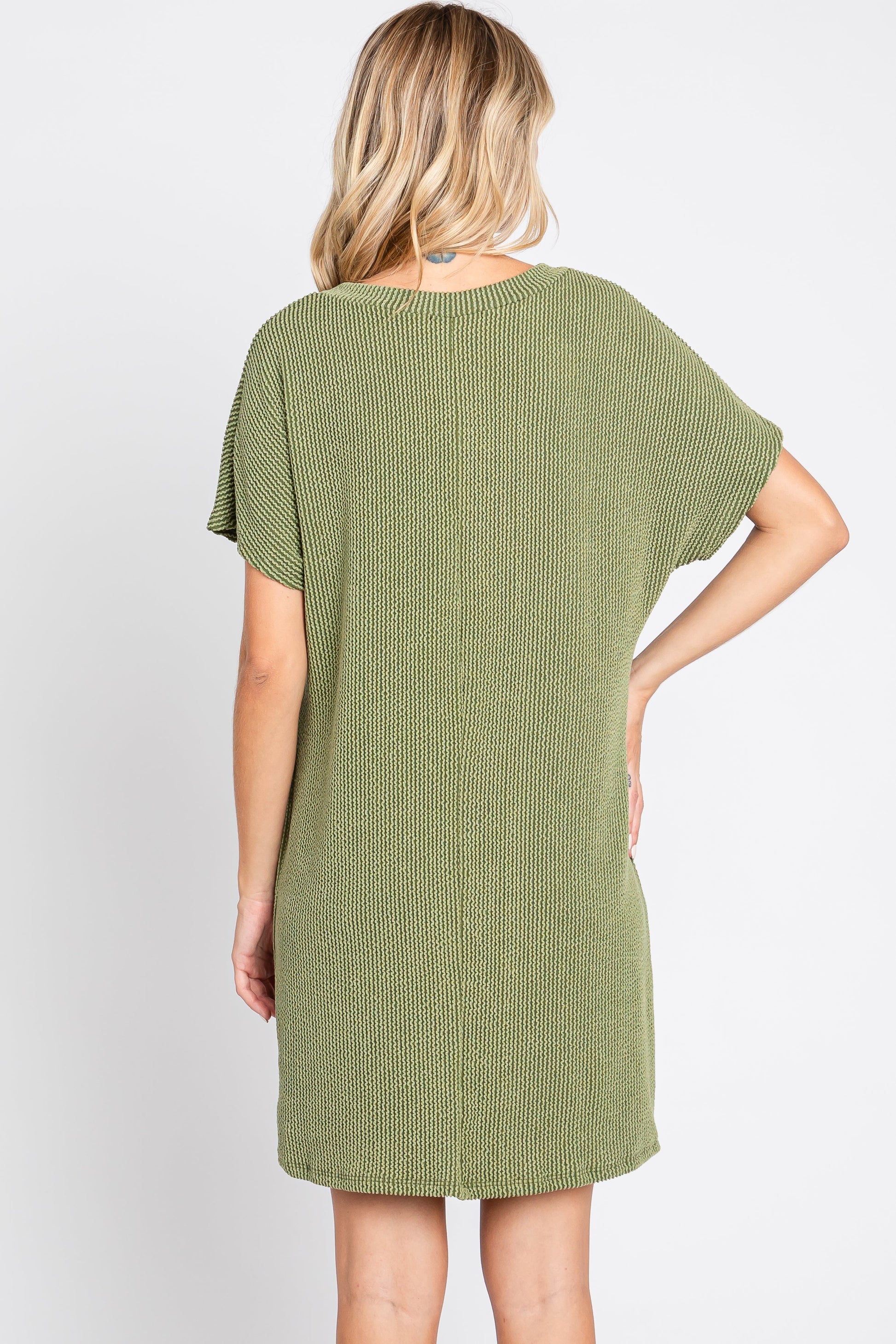 Olive Ribbed Front Pocket Dolman Short Sleeve Dress