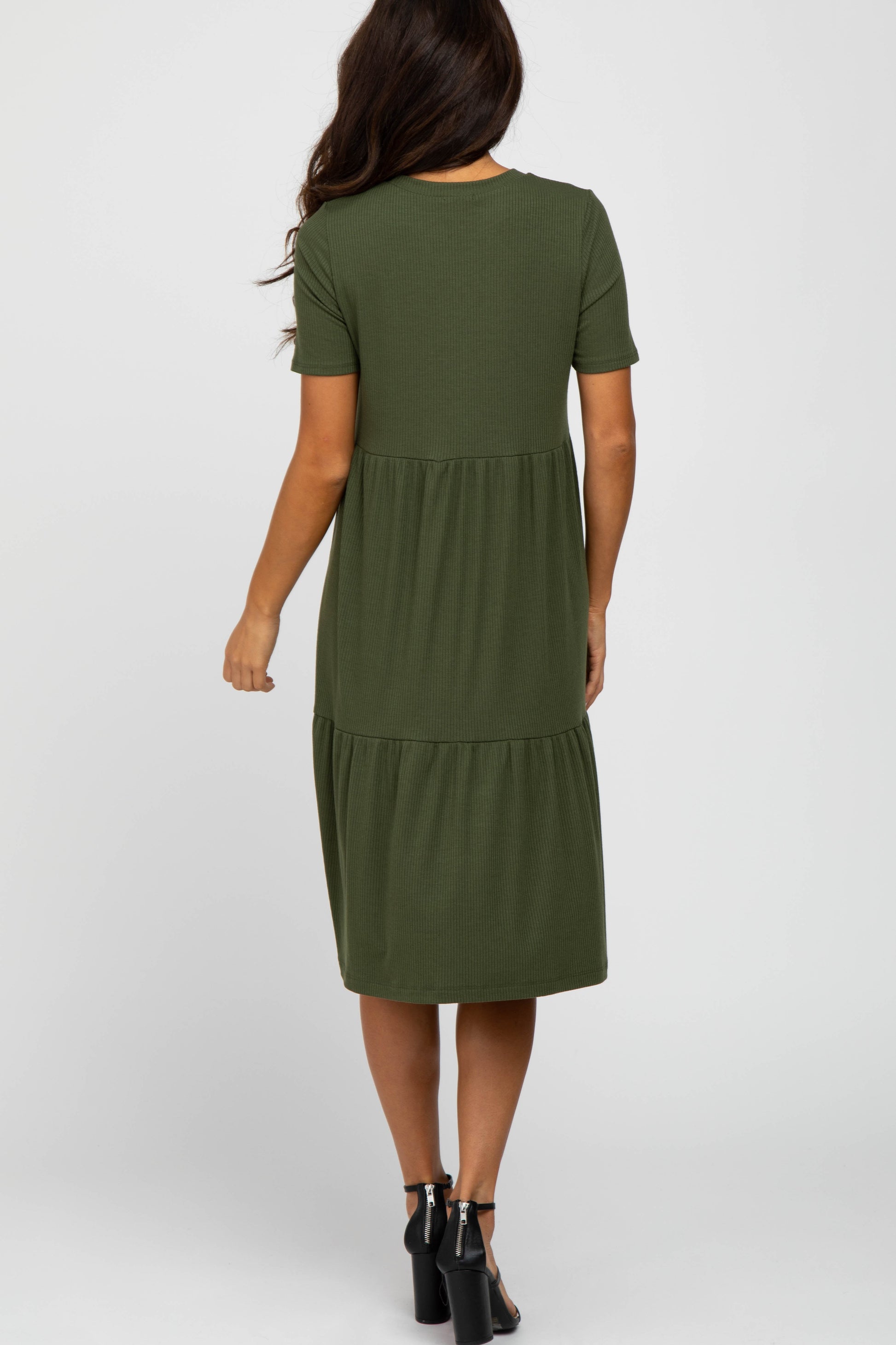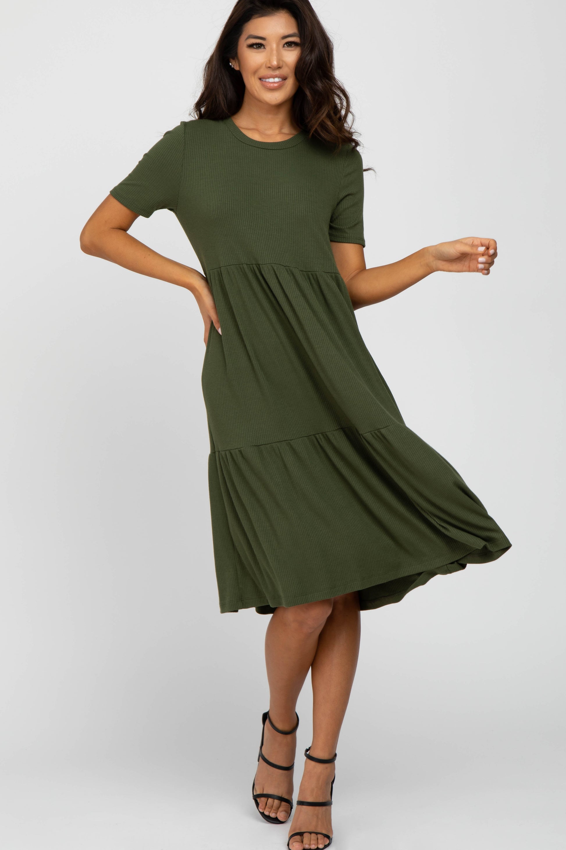 A solid ribbed short sleeve dress with scoop neckline and tiered body.