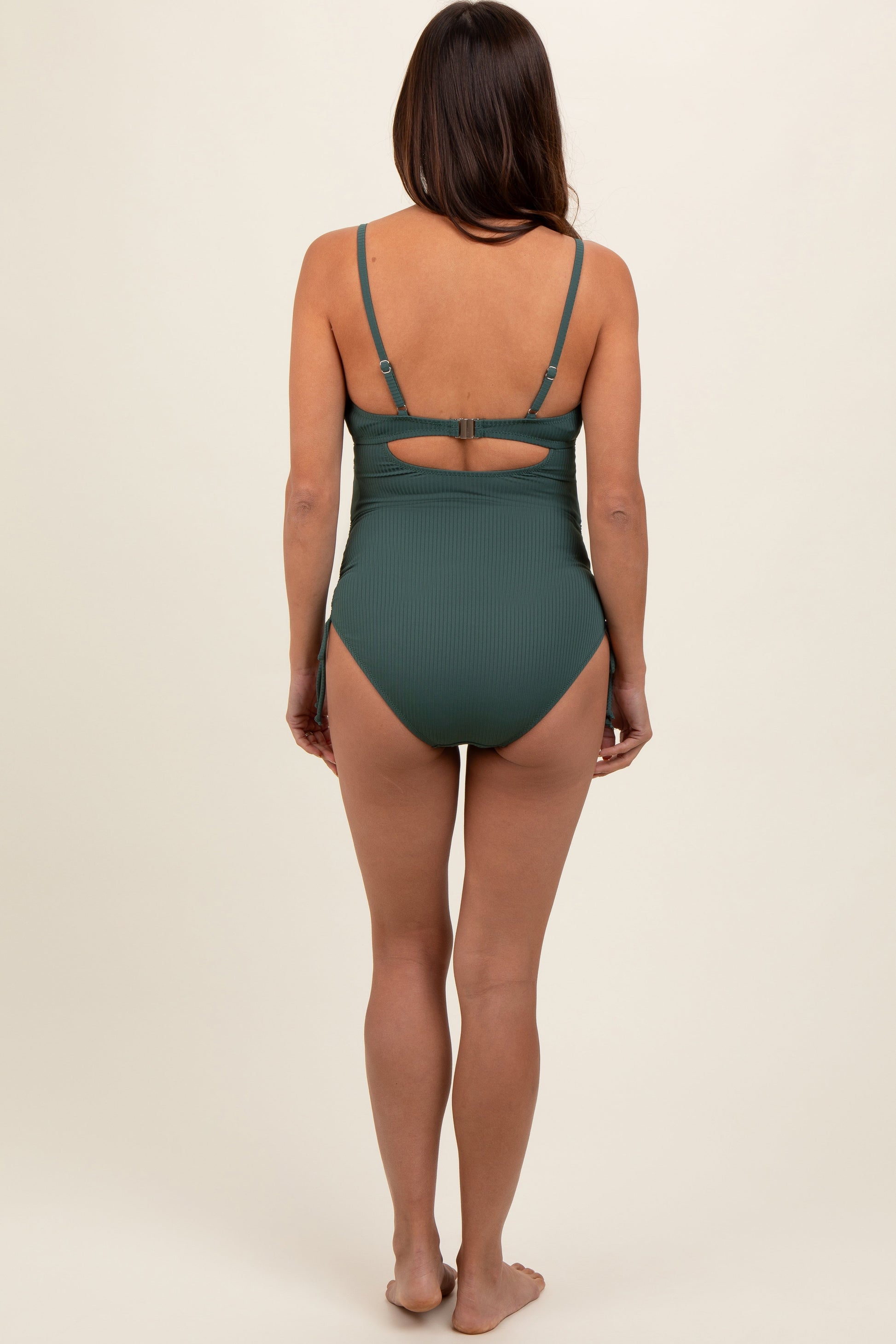Olive Ribbed Wrap Front Drawstring Side Maternity One-Piece Swimsuit