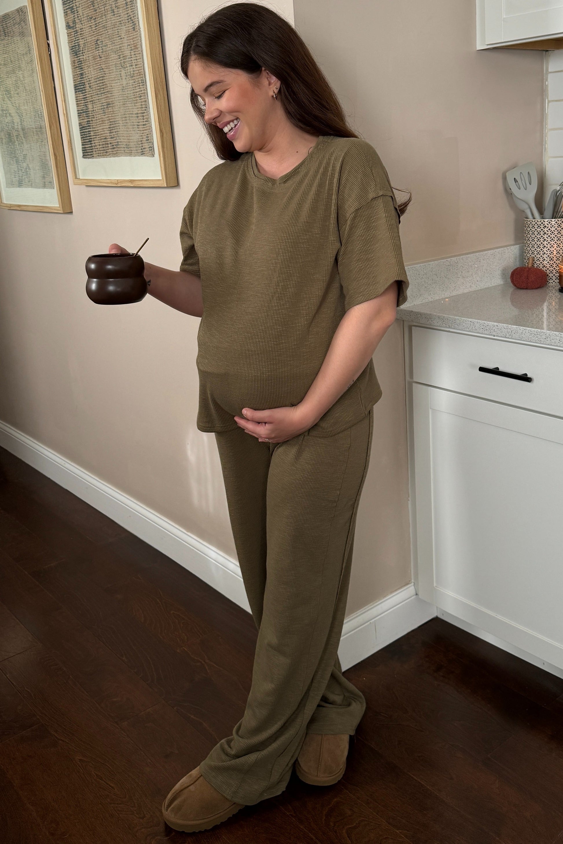 Experience effortless comfort and elevated style with our Olive Textured Knit Oversized Tee and Pants Maternity Set. Carefully crafted for mom-to-be, this set features a relaxed-fit, drop-shoulder top and matching elastic-waist pants, both in a soft, lightly textured knit that moves with you. The oversized silhouette is perfect for accommodating your growing bump and transitioning through every trimester—and postpartum too! Dress it up with sandals or keep it casual for lounging at home. A versatile must-have for modern maternity wardrobes.