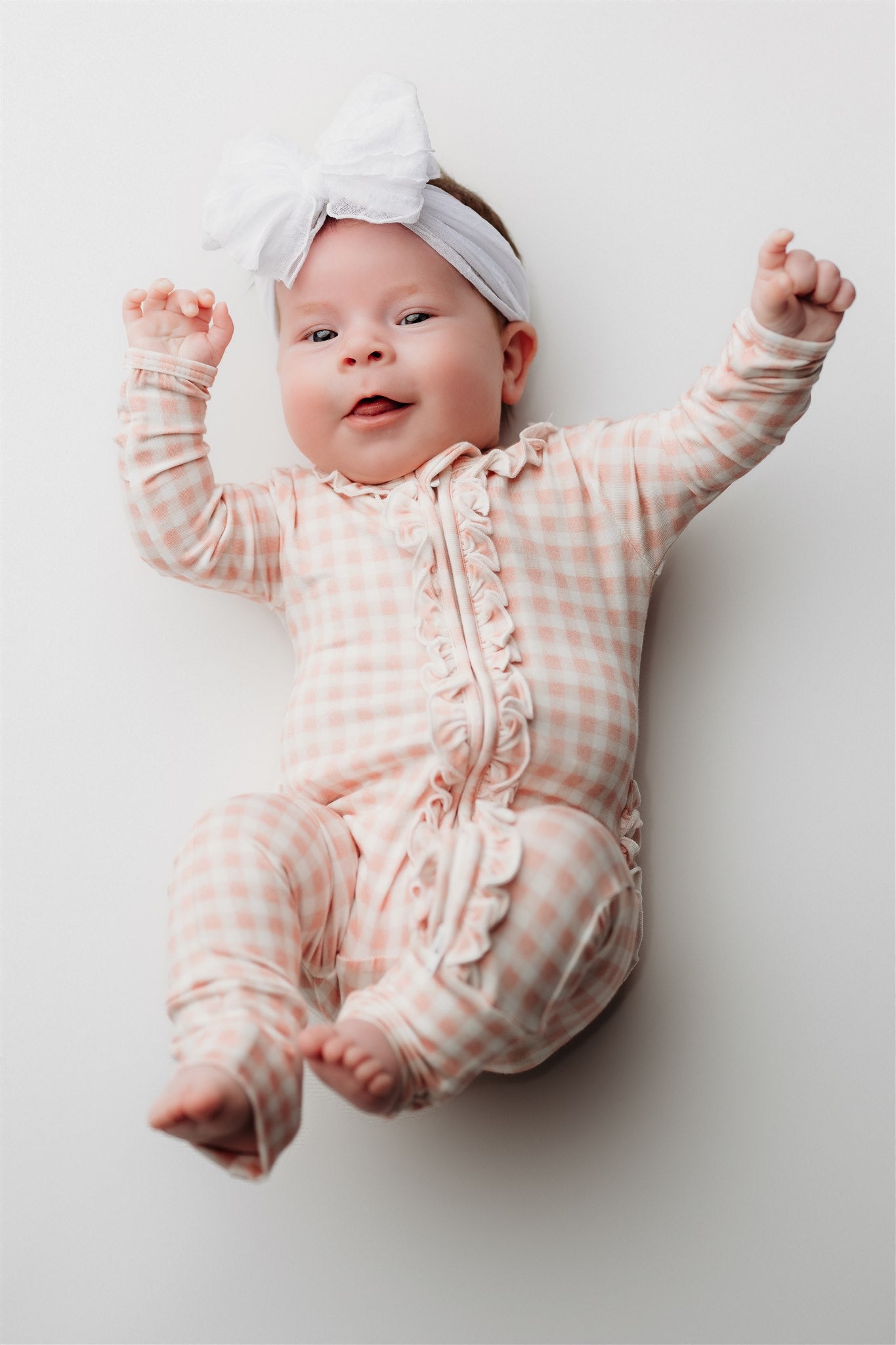 Our Olivia Footie was designed with comfort in mind, Rockin Royalty zip footies are so soft you will want all designs! They are created with custom printed Viscose from Bamboo fabric made to be soft, comfortable, and stretchy for your little one while the added details make a unique stylish outfit! The multi way zipper allows for easy night-time diaper changes. The fold-over no-scratch cuffs on hands and feet prevent scratches and keep baby warm day and night. Your baby is sure to be snug, stylish, and comfy 24/7! Purchase as a great take home outfit with the coordinating Mommy Robe and swaddle blanket to match your new little arrival.