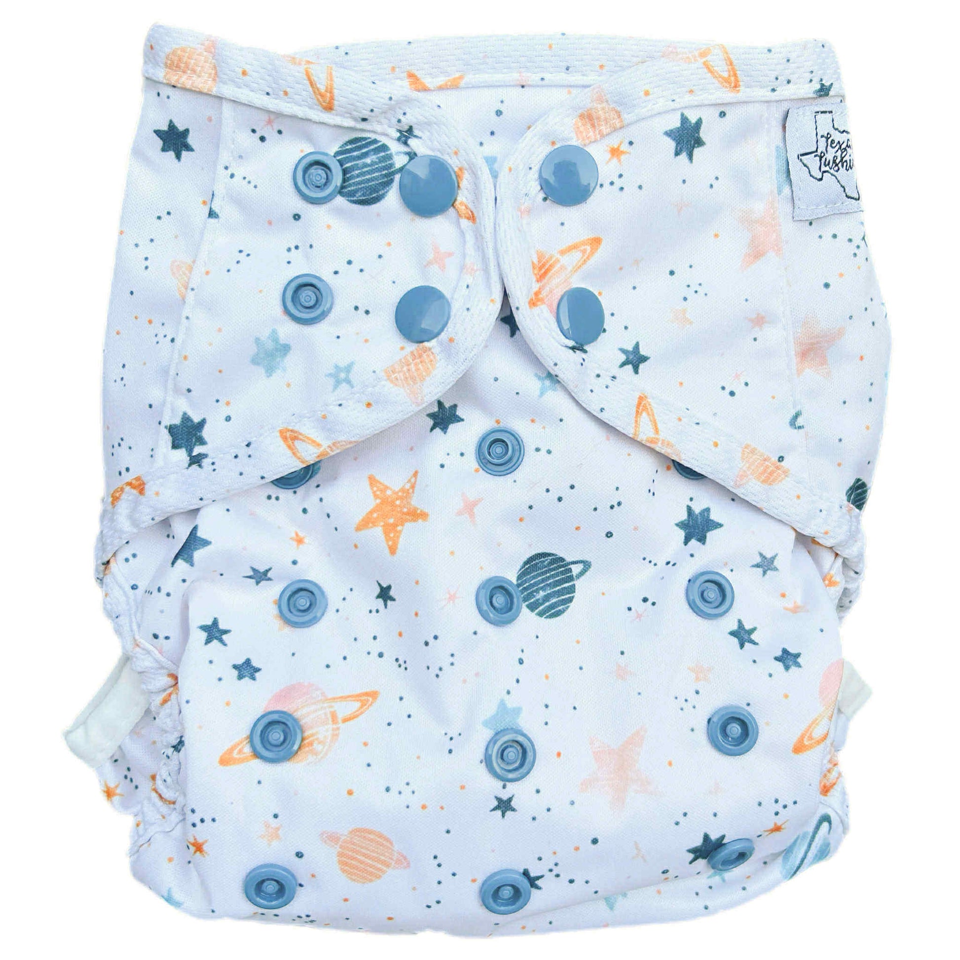 This is a One Size Cover cloth diaper fitting babies approximately 8-9lbs up to 40lbs. Updated version of our previous one size covers. Same great fit, now with more customization.