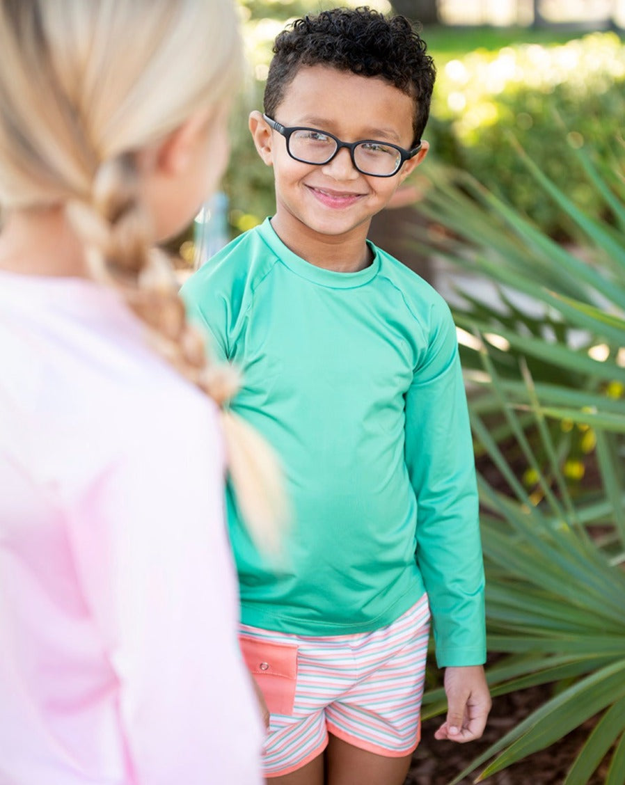 Enjoy the sunshine in these Orange Delight Striped Swim Trunks. They feature a drawstring waist and are fully lined for comfort. Add a personal touch with a monogram on the left leg.