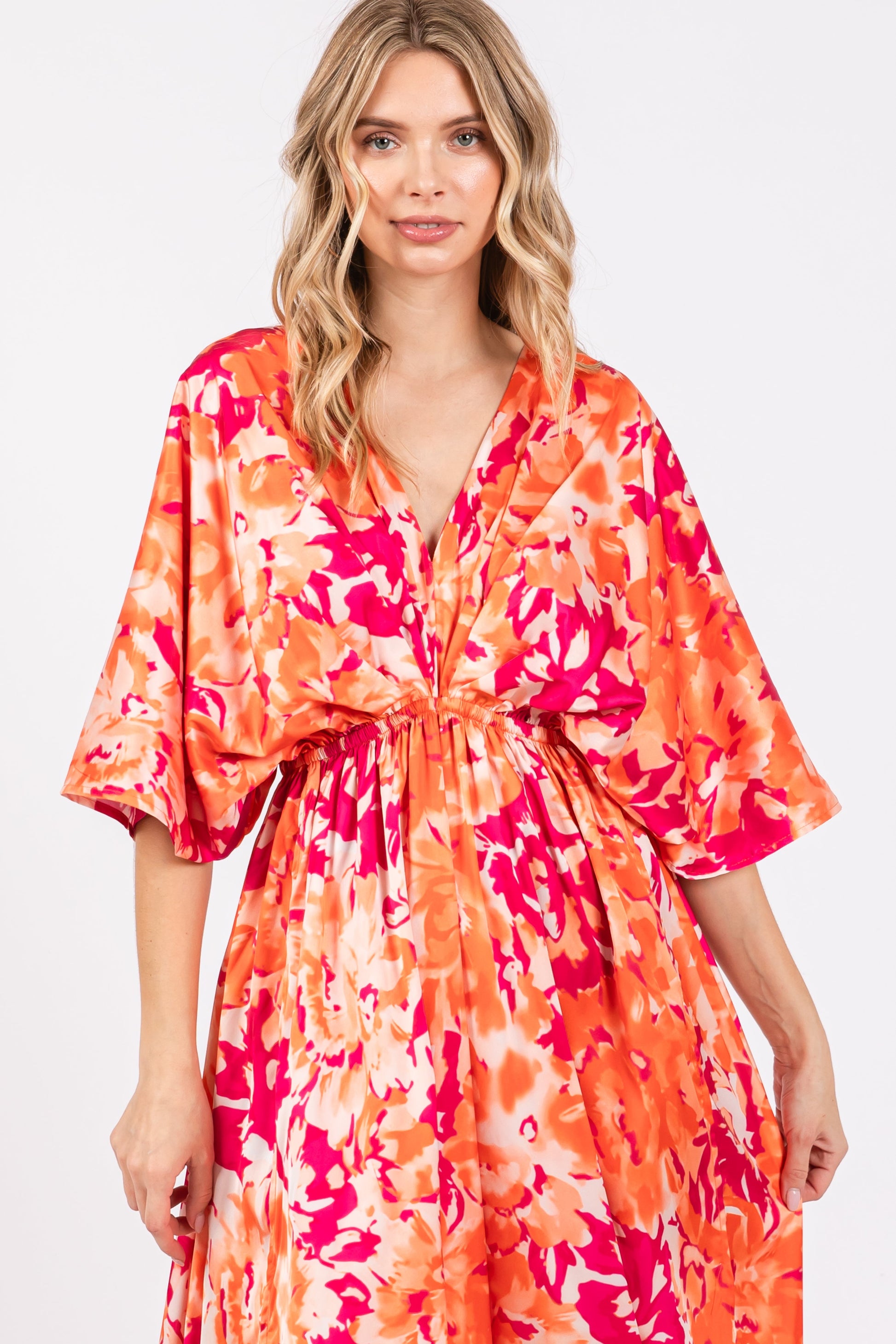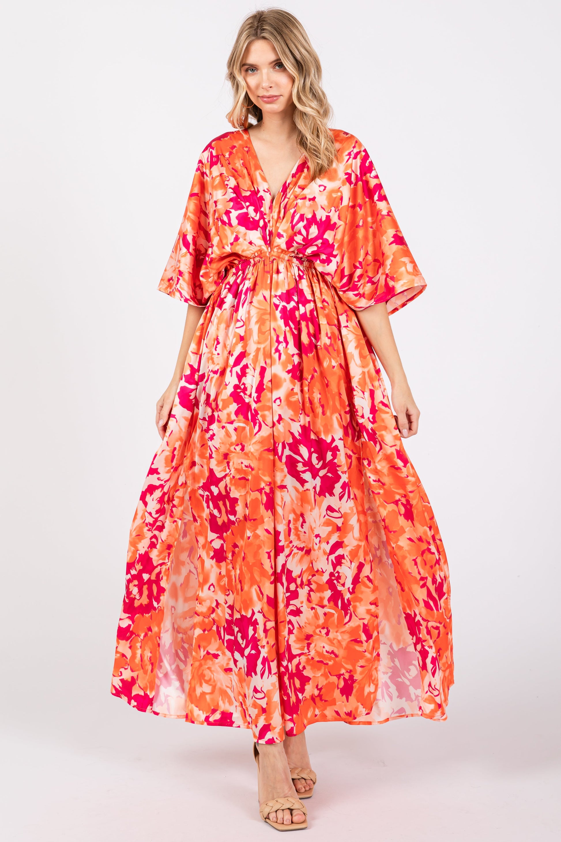 A satin floral maxi dress featuring a v-neckline, short dolman sleeves, an elastic waist, and two front slits.