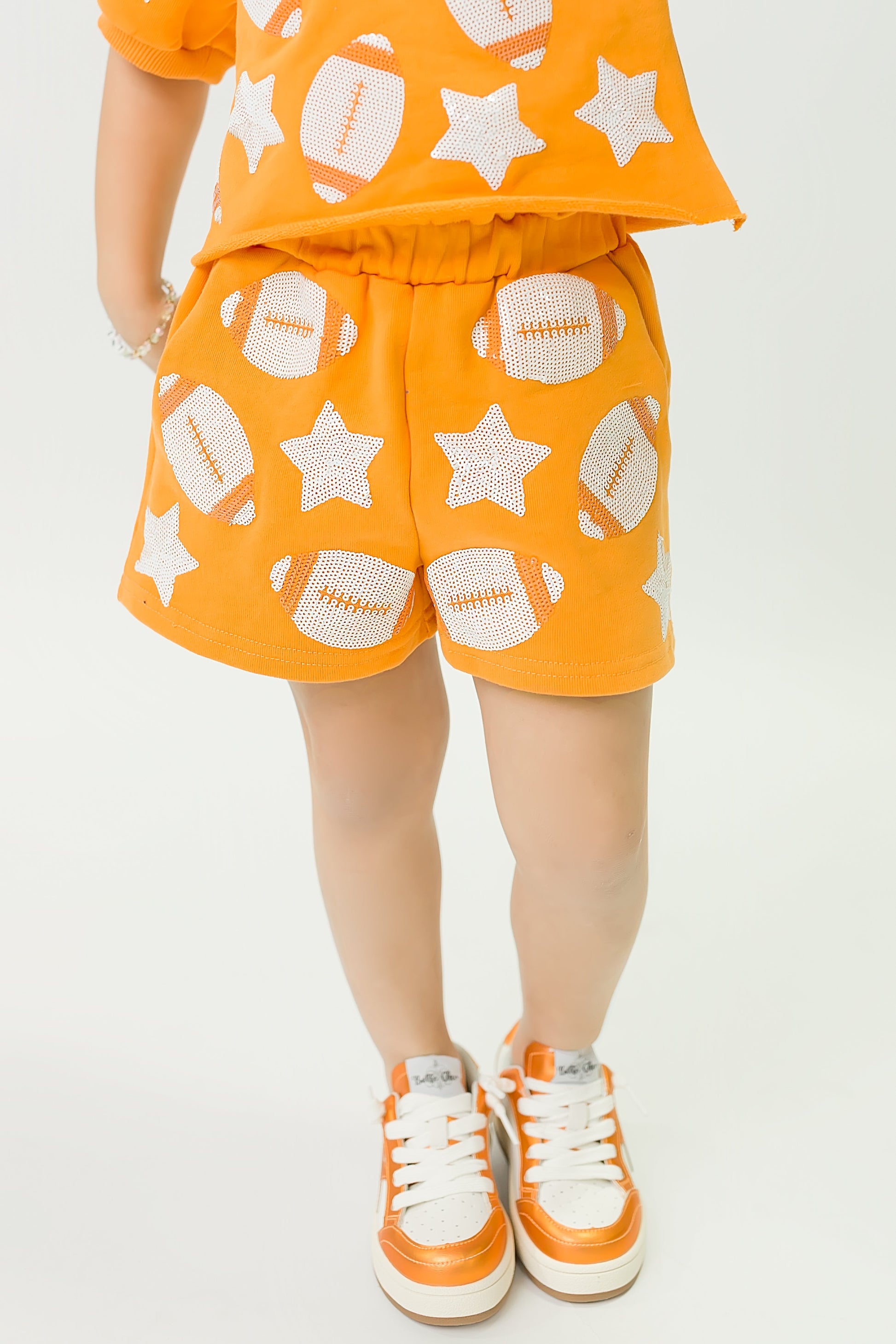 Get ready to shine on game day with these playful Orange Football Shorts! Covered in sparkling sequins, it adds a fun, festive vibe to your football spirit. Perfectly designed as part of a matching set, it makes cheering on your team stylish and effortless.
