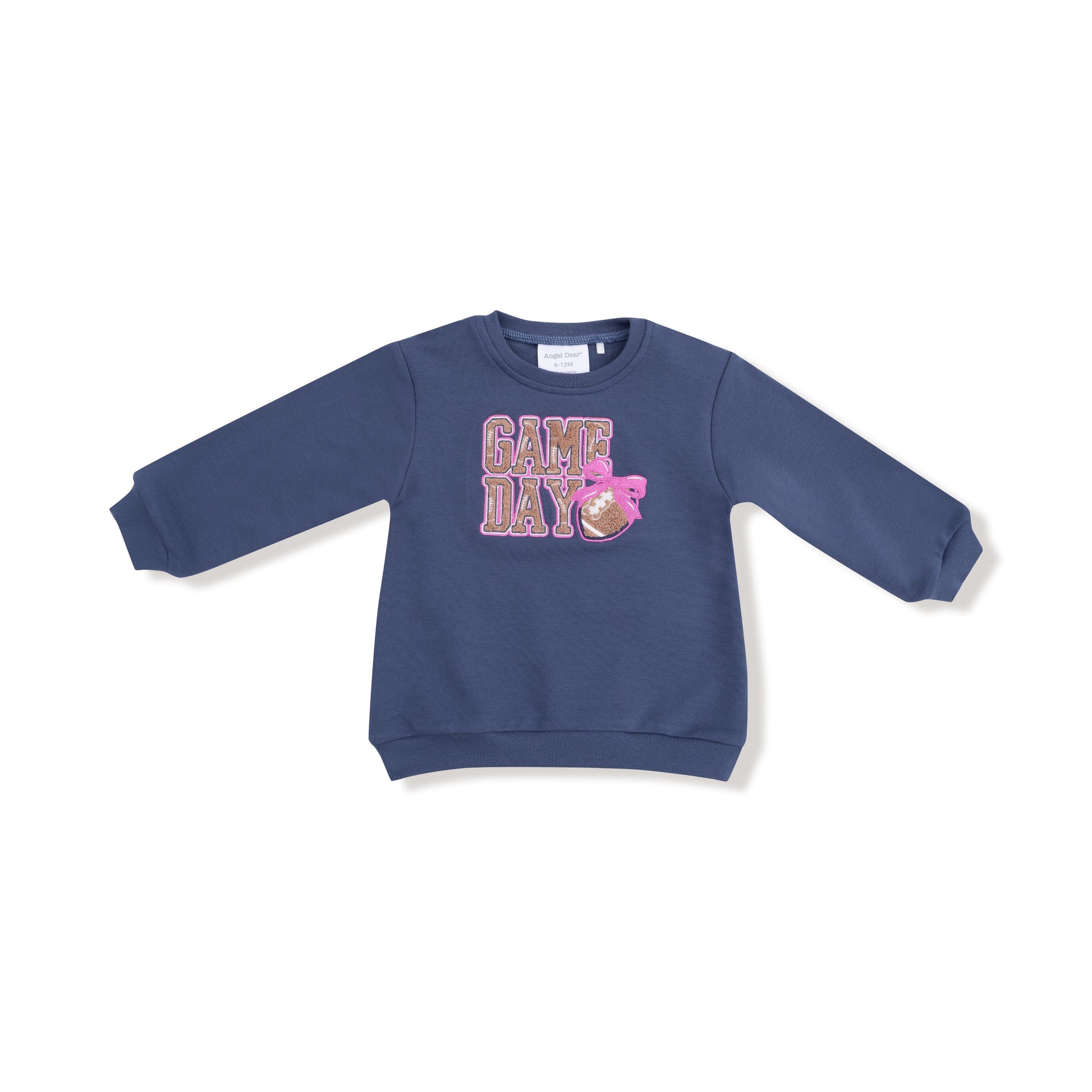 Get your little one all set for game day vibes and cozy cuddles! Our Oversized Sweatshirt made from soft French Terry features playful ""Game Day"" applique alongside a textured football with bow chenille applique, a perfect blend of sporty spirit and sweet style. The roomy fit keeps your tiny fan warm and comfy from kickoff to cuddle time.