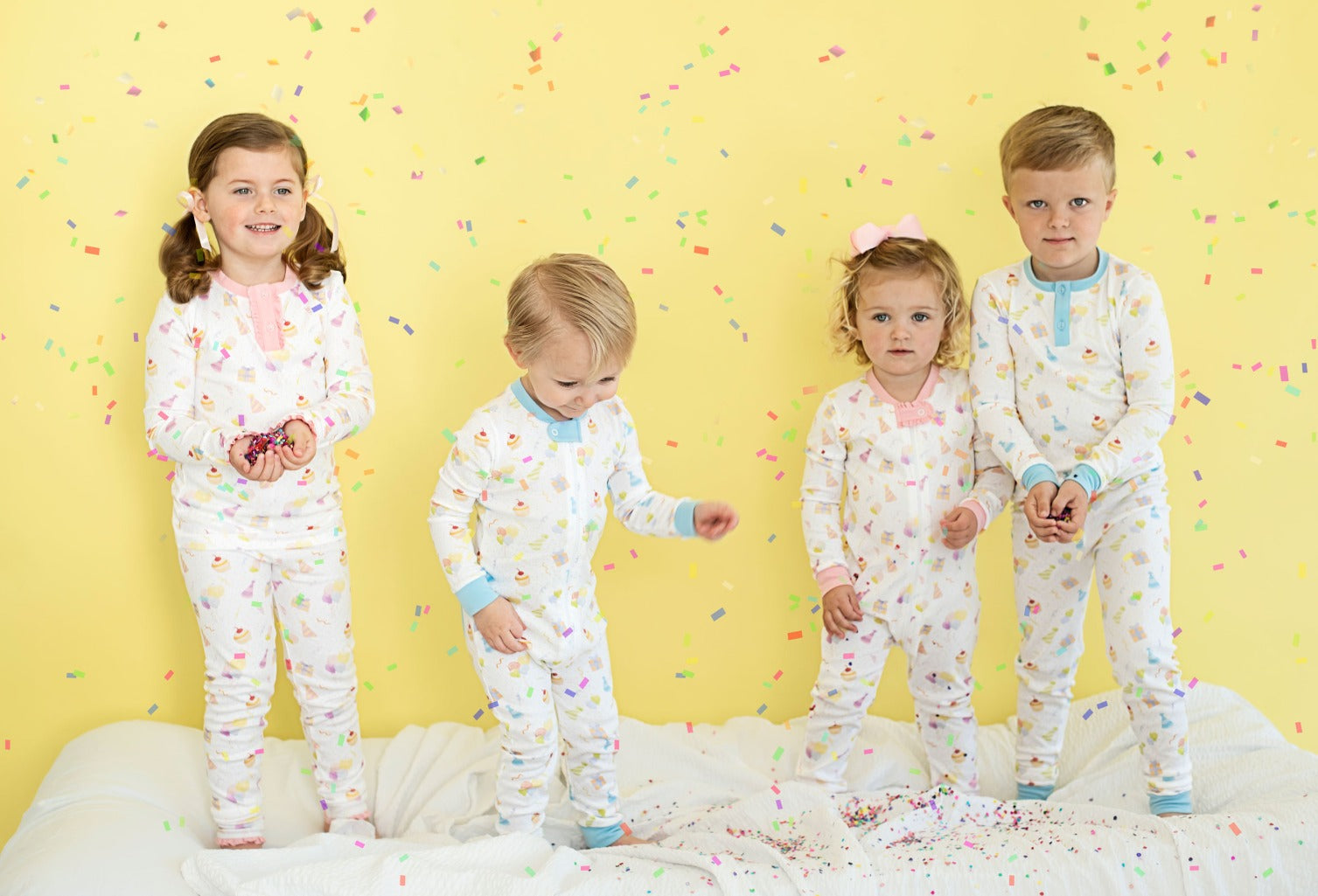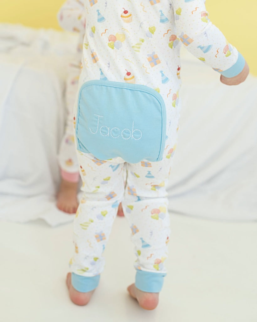 Wake up ready to party in this fun and festive birthday pajama set, perfect for celebrating your little one's special day. This birthday pajama features a snug fit for cozy comfort and can be personalized with a monogram in vintage block font with white thread. Let your child start their birthday morning in style with this adorable sleepwear designed just for their big day!