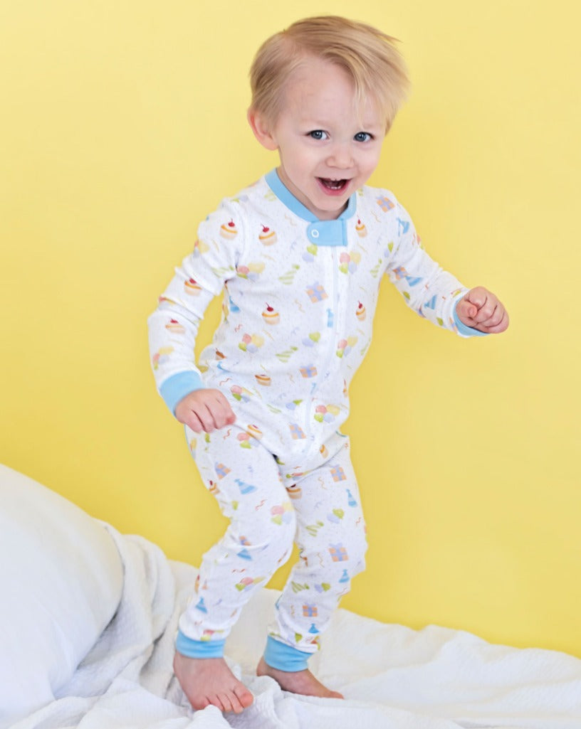 Party Time Pima Zip Up Pajamas with Blue Trim- FINAL SALE
