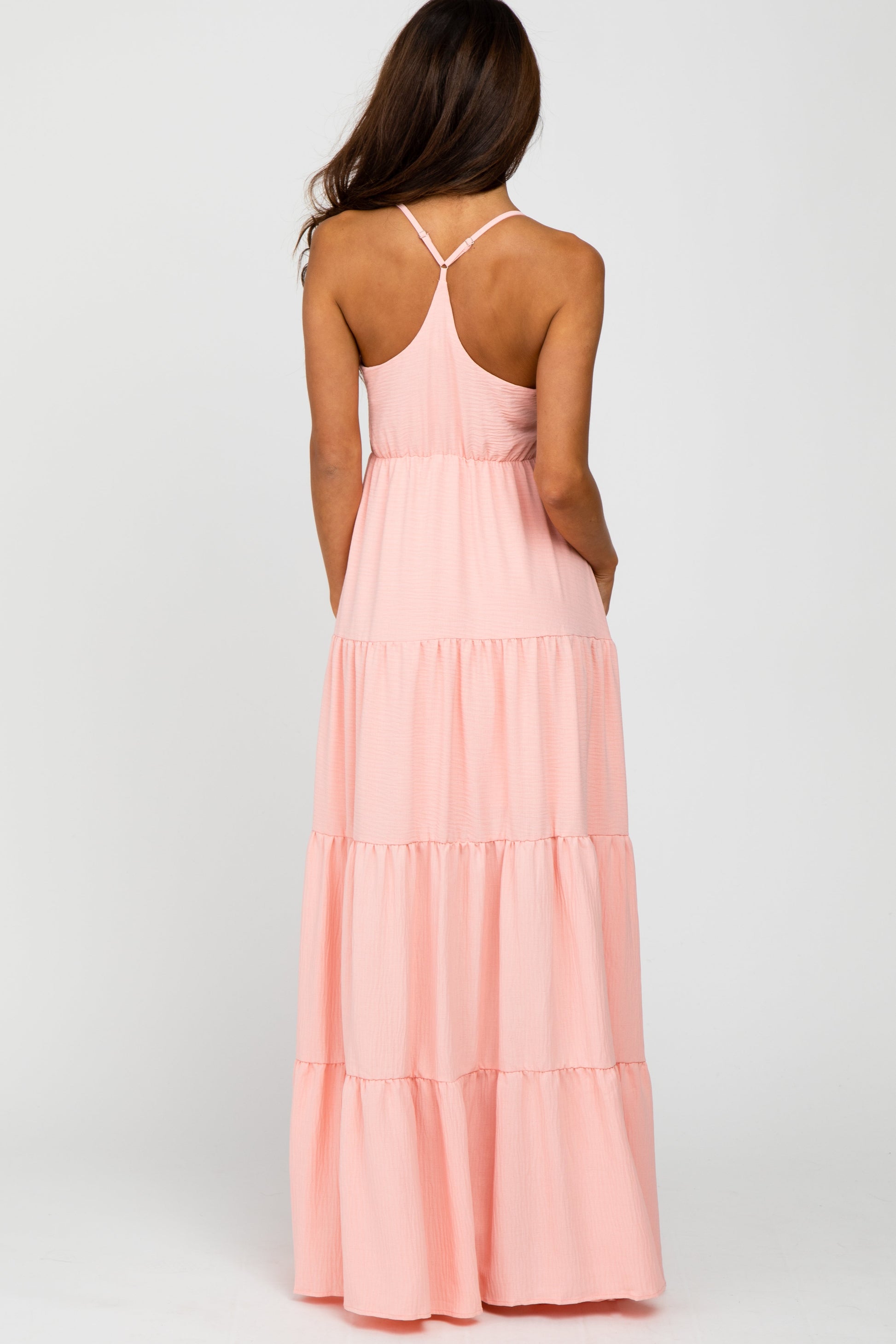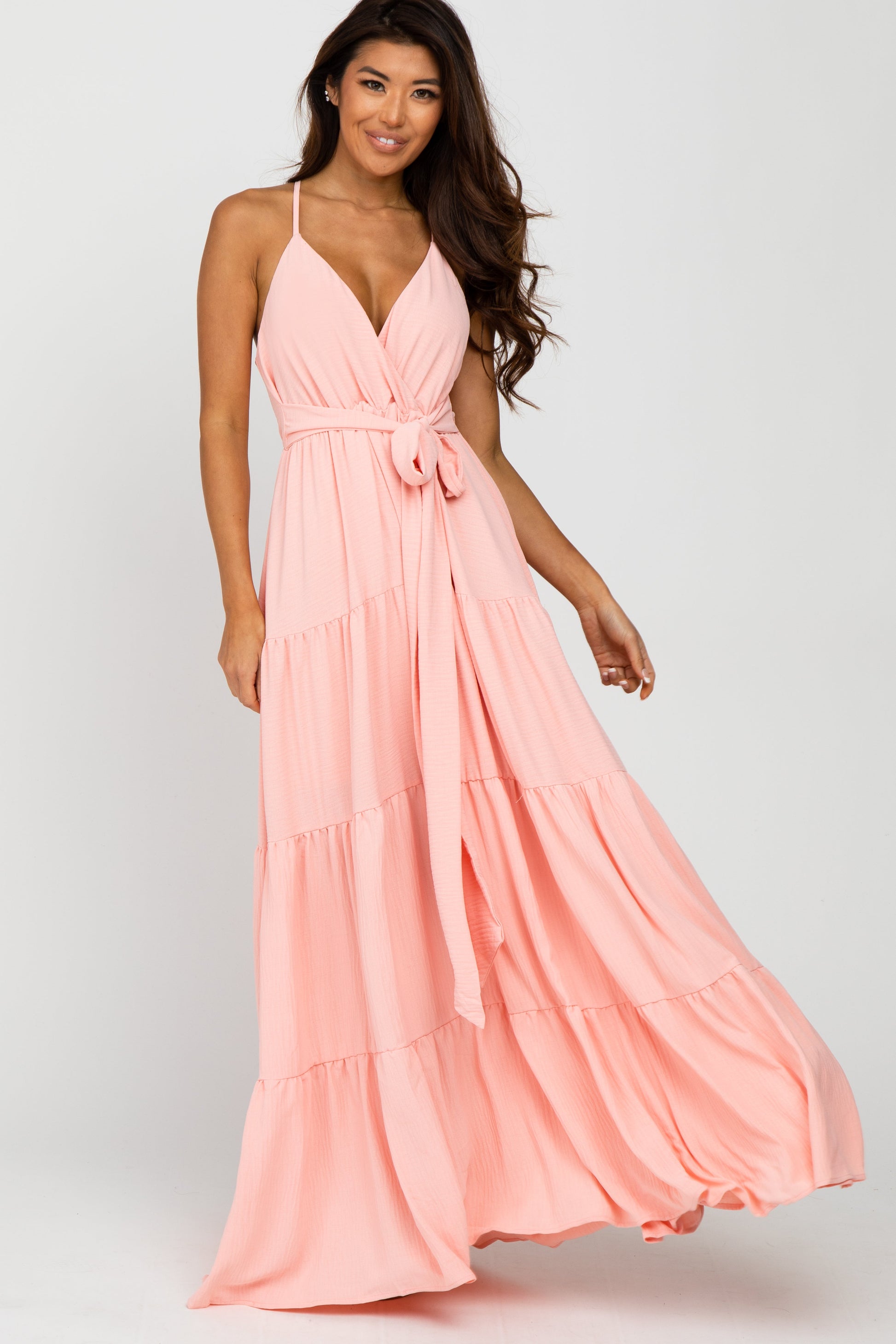 A maxi dress featuring a wrap front v-neckline, a racerback with adjustable straps, an adjustable tie at the back, pleated tiers and double lined.