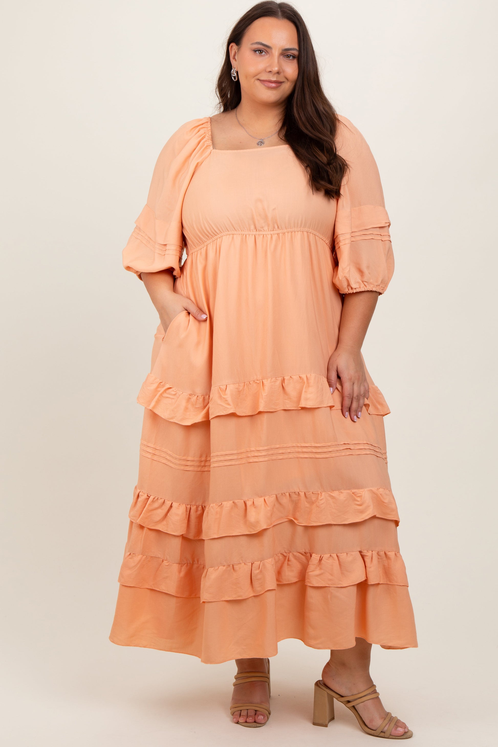 Peach Square Neck Ruffle Tiered Plus Maxi Dress