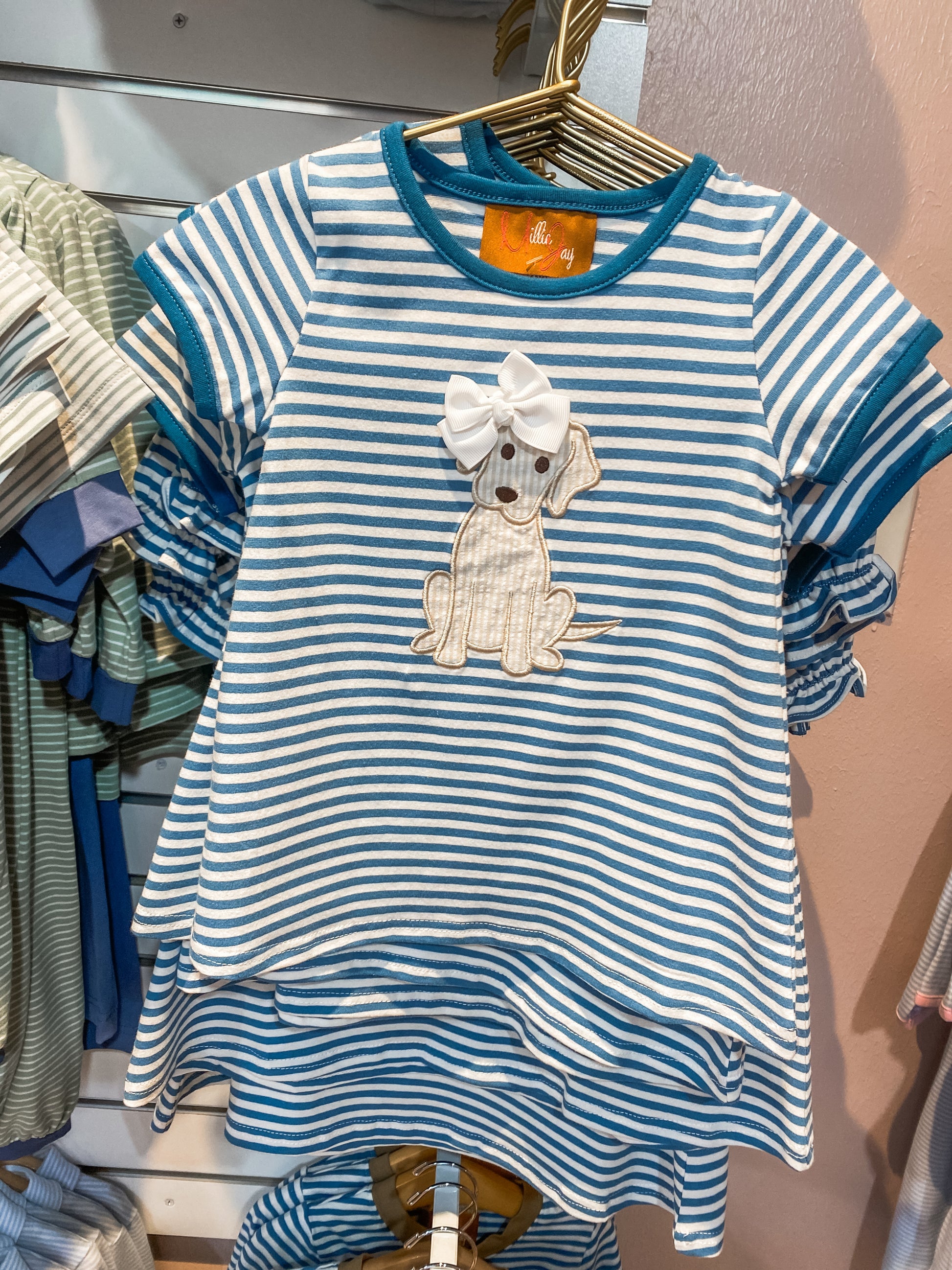 Sweet, playful, and oh-so-cute — our Penny the Puppy Dress is perfect for everyday adventures! This short-sleeve dark teal and white striped dress features an adorable puppy appliqué with a 3D bow, adding just the right touch of charm.