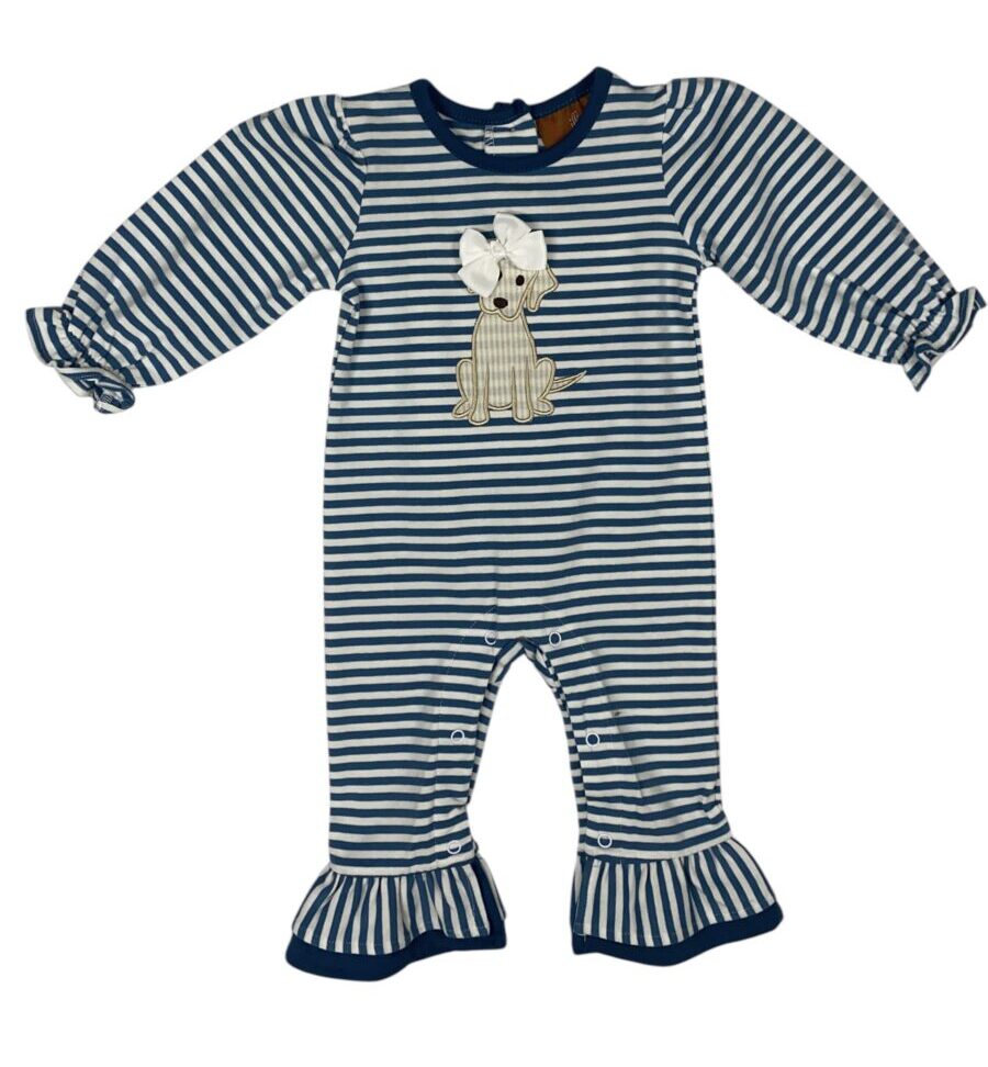 Cuteness overload! Our Penny the Puppy Girls Romper features dark teal and white stripes with an adorable puppy appliqué and a sweet 3D bow. Ruffle cuffs at the wrists and ankles add the perfect girly touch, while snap closures make changes quick and easy.