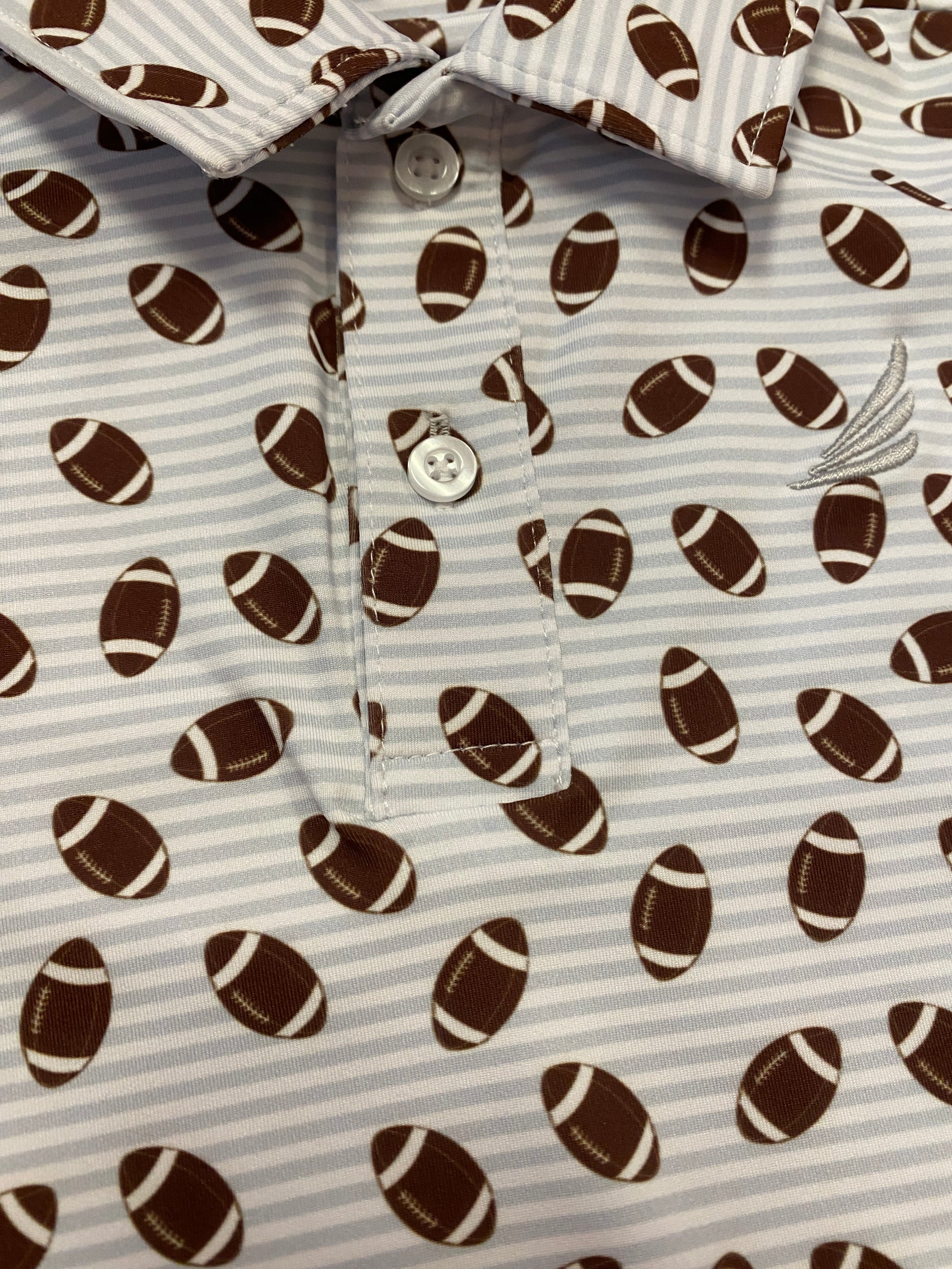 Featuring an all-over brown football pattern on a light gray and white striped background, this short-sleeve collared romper is perfect for your tiniest fan. Made from a lightweight, stretchy performance fabric, it keeps your baby cool and comfy all season long—whether you’re tailgating, cheering on your team, or snapping those adorable fall photos!