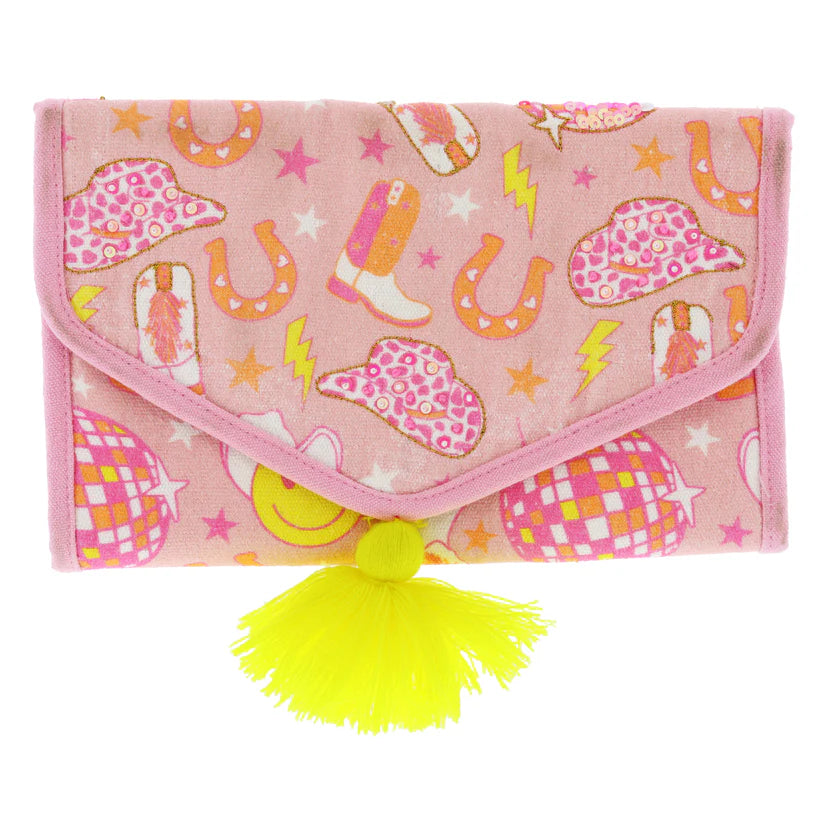 Keep your sparkle safe (and stylish!) with our Pink Disco Cowgirl Jewelry Organizer! Featuring the cutest western-meets-disco print — cowgirl hats, boots, horseshoes, lightning bolts, smiley faces, and pink disco balls — this soft organizer is perfect for storing earrings, necklaces, bracelets, and more while at home or on the go.