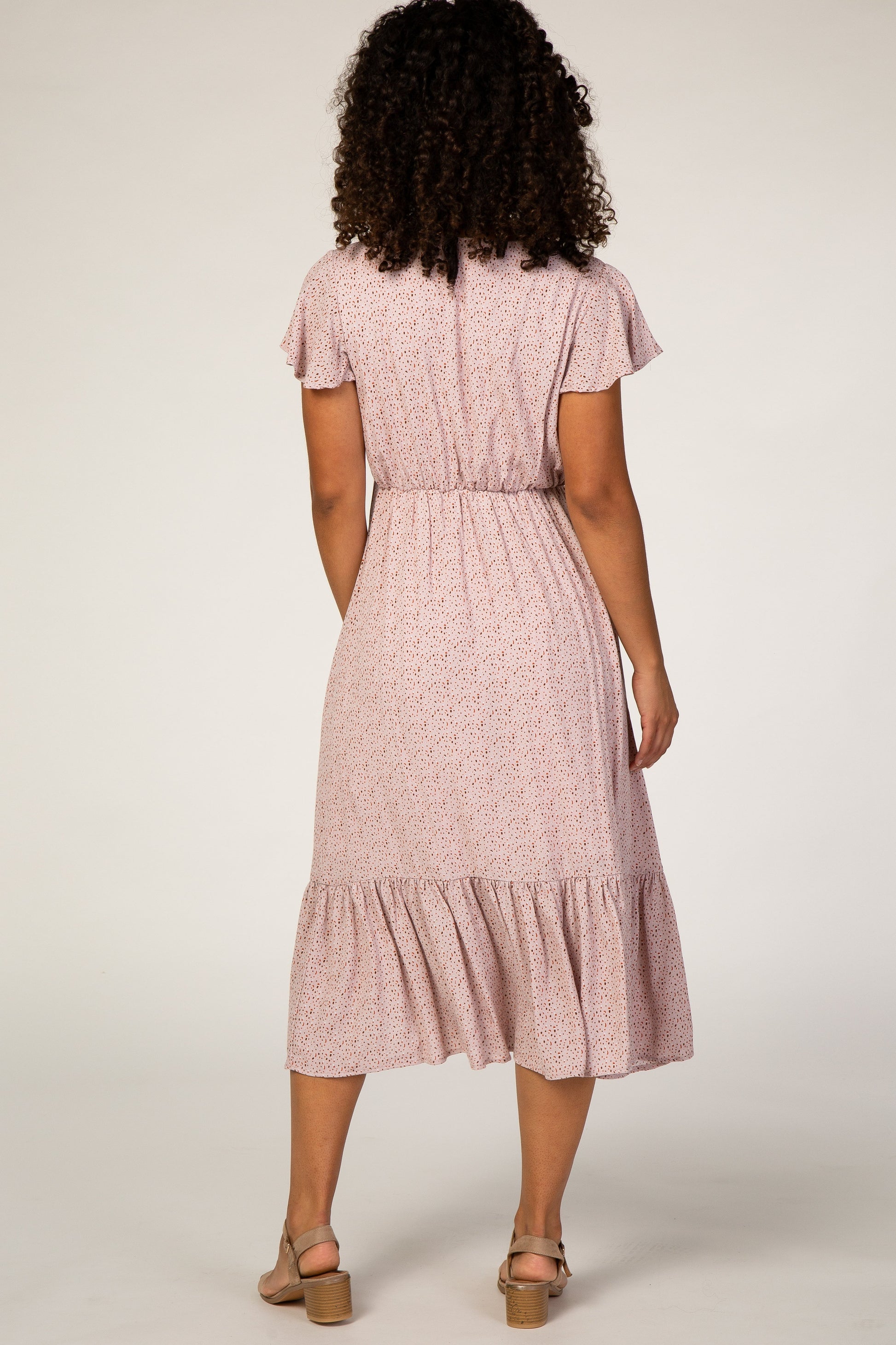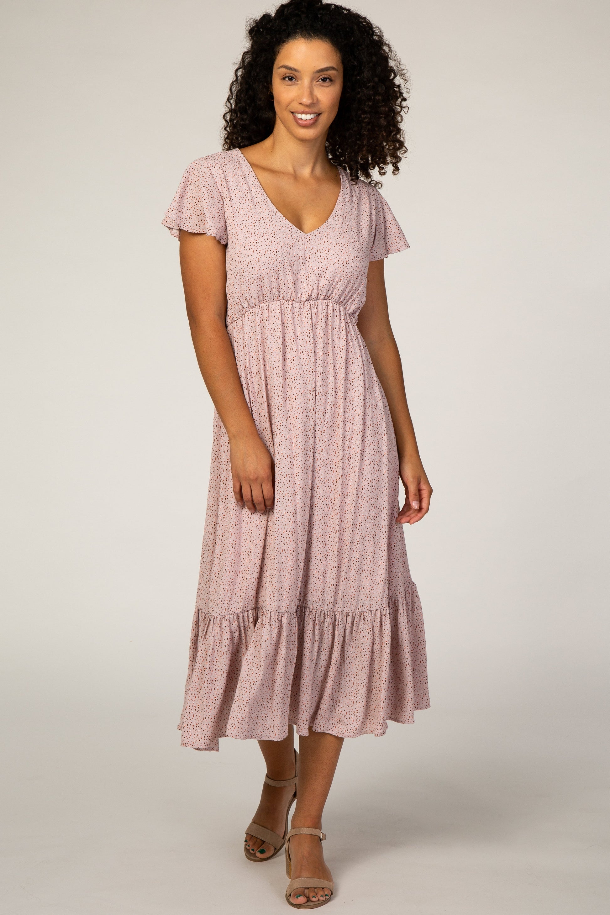 A midi dress with an empire waist, v-neckline, and ruffle accents. Double lined to prevent sheerness.