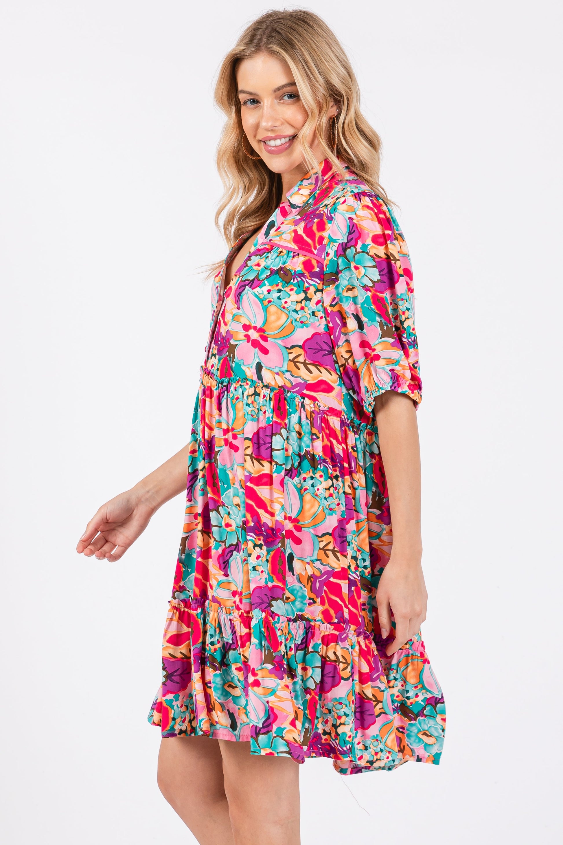 Floral short sleeve dress with front buttons, collard v-neckline, and tiered skirt.