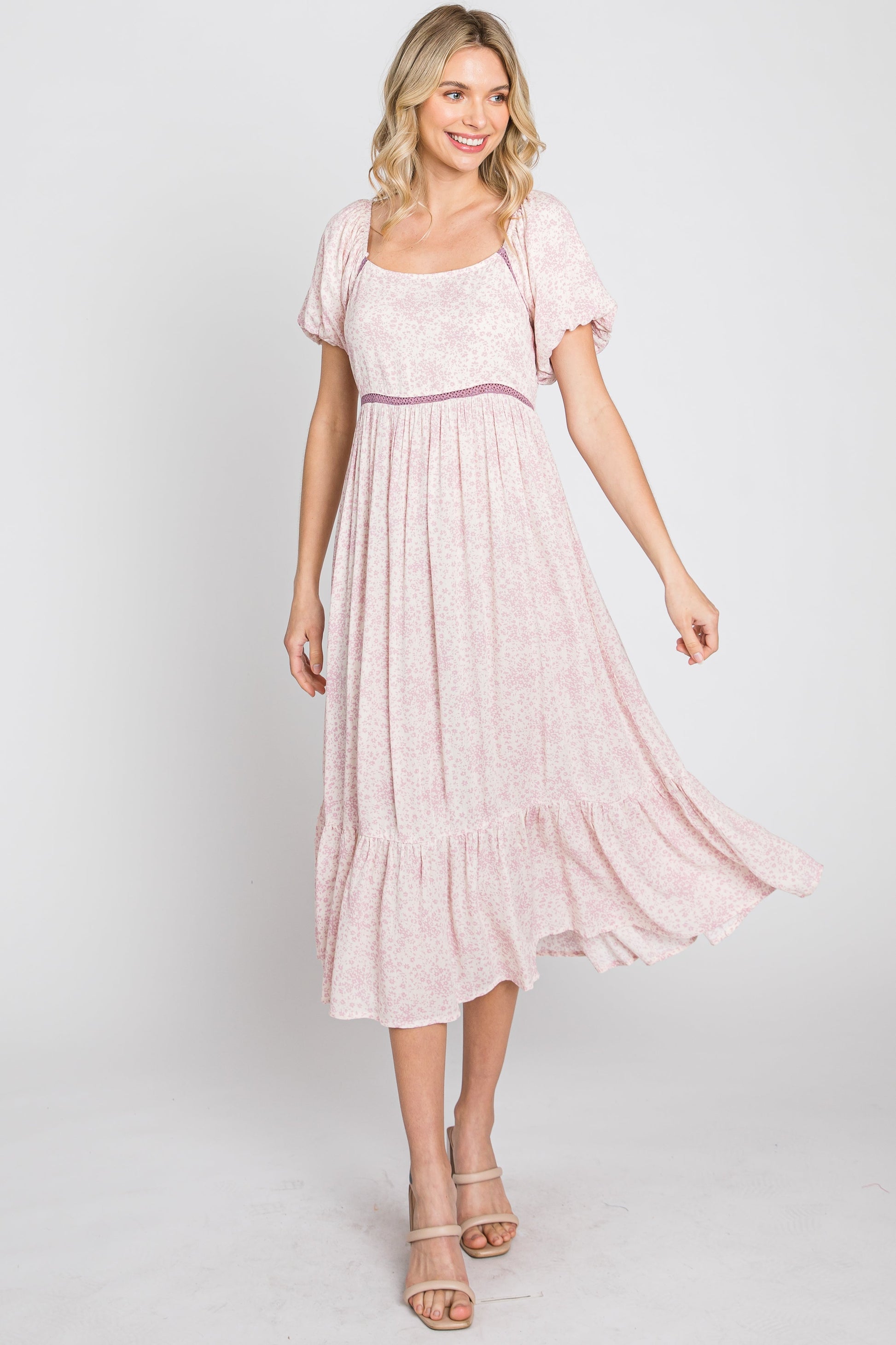 A floral print dress with puff sleeves, crochet accents and ruffle hem.
