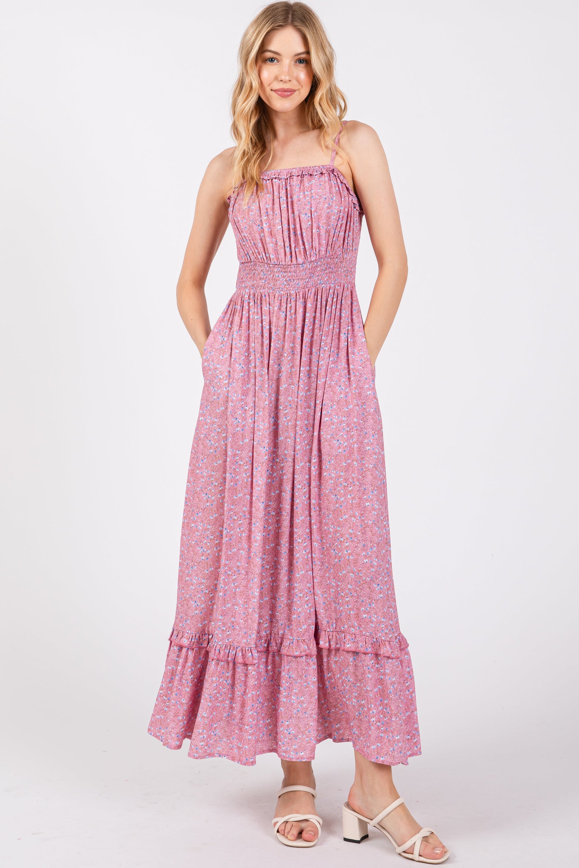 Pink Floral Ruffle Square Neck Smocked Waist Maxi Dress