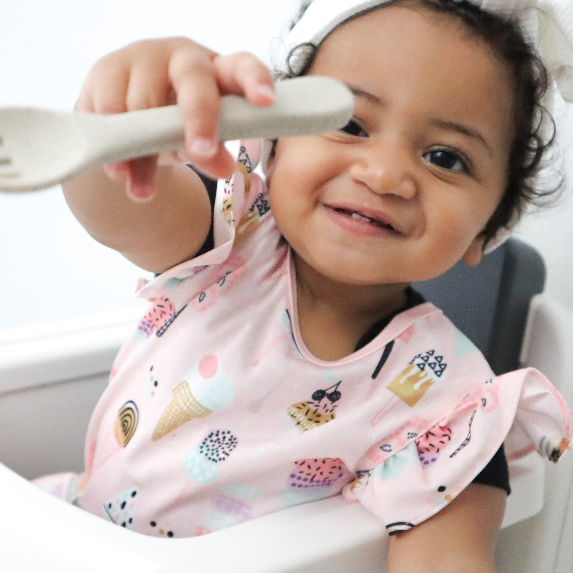 Thoughtfully designed to cover more than traditional bibs, protecting laps, sides, and outfits underneath.