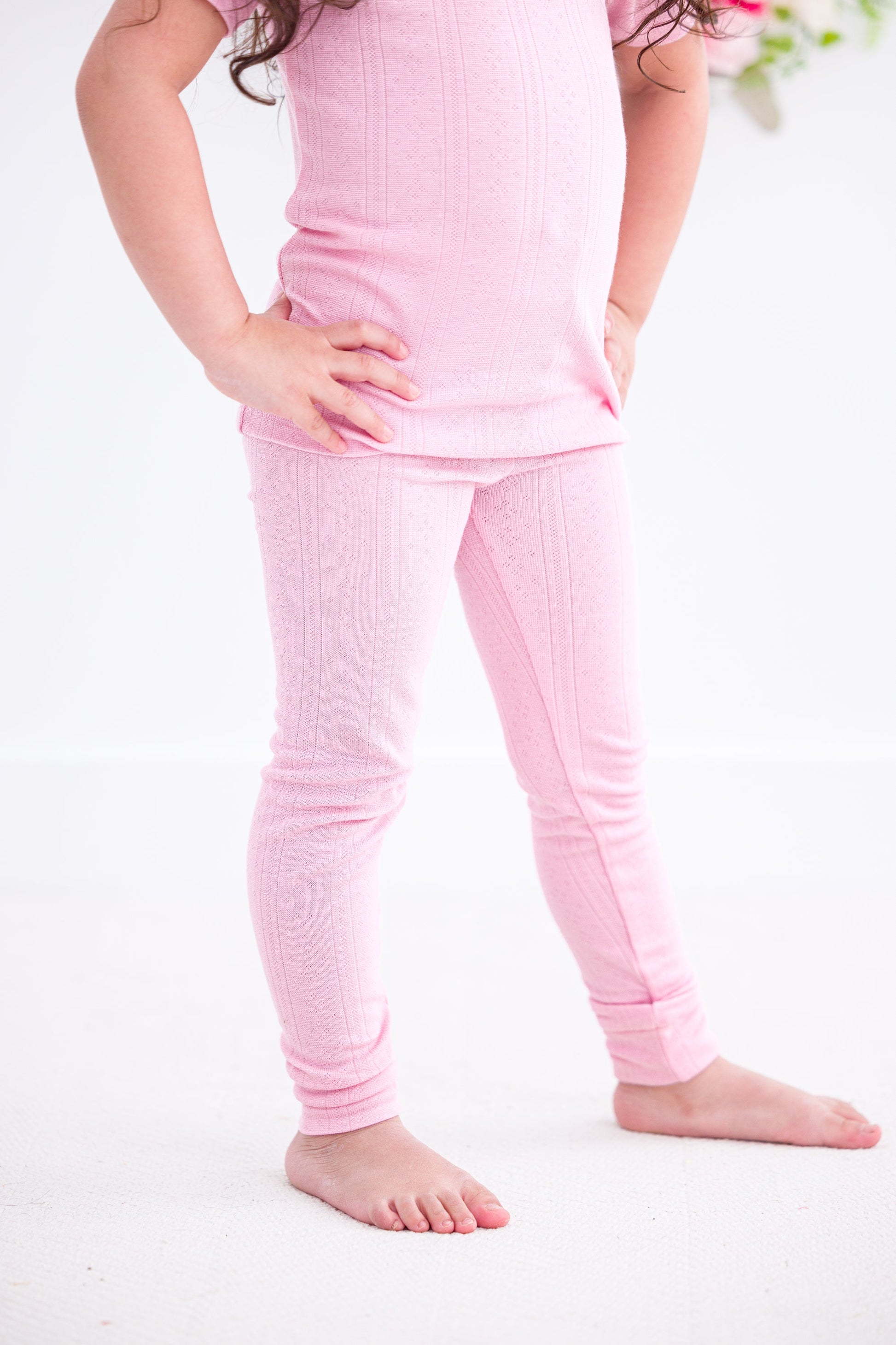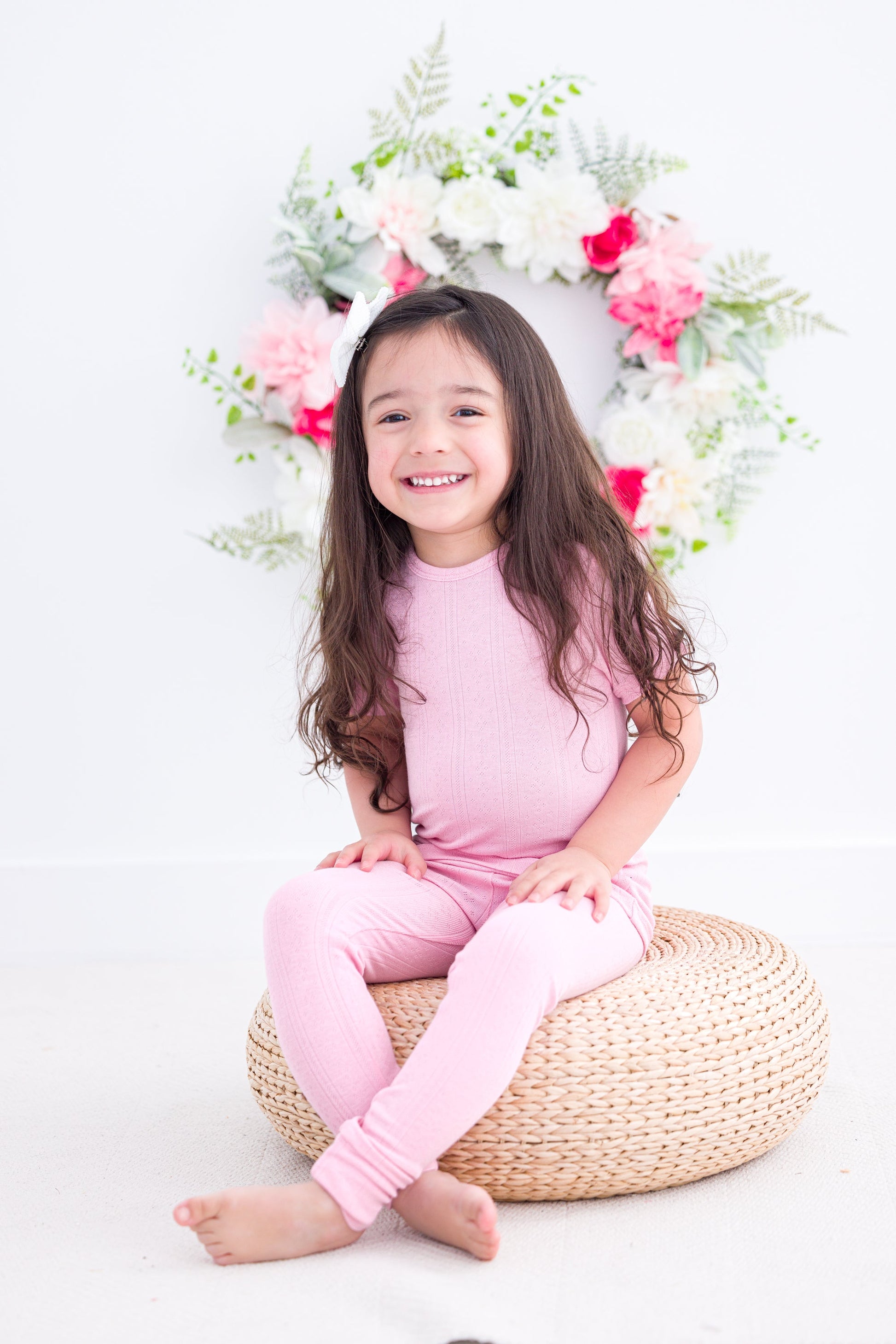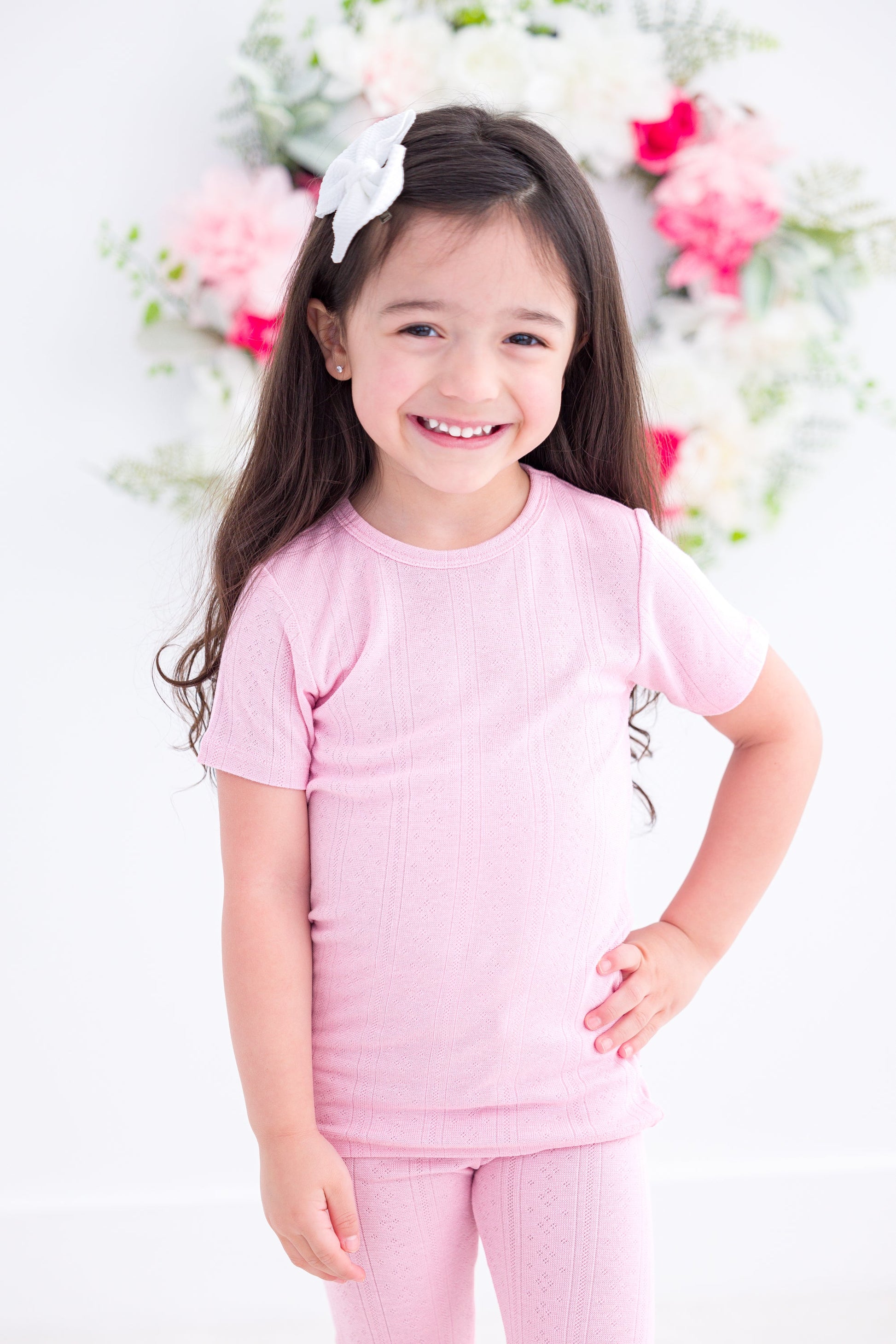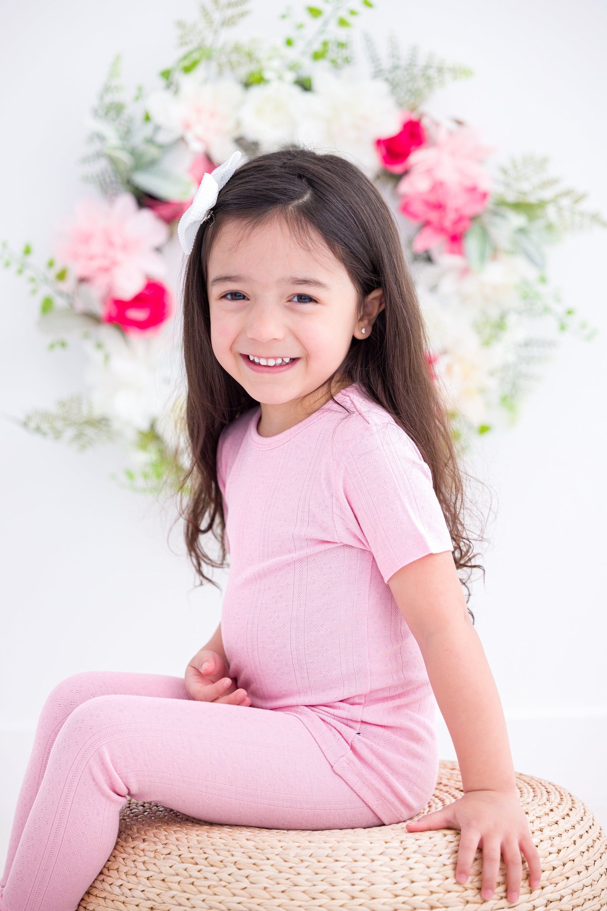 These pointelle pajamas are the perfect blend of comfort, style, and breathable elegance. Crafted from a luxurious mix of bamboo viscose and spandex, the lightweight fabric features a delicate, airy texture with a subtle sheer effect, thanks to its beautifully woven design. Soft, snug, and perfect for sensitive skin, these pajamas are sure to become a bedtime favorite, keeping little ones cool, comfy, and cozy all night long.