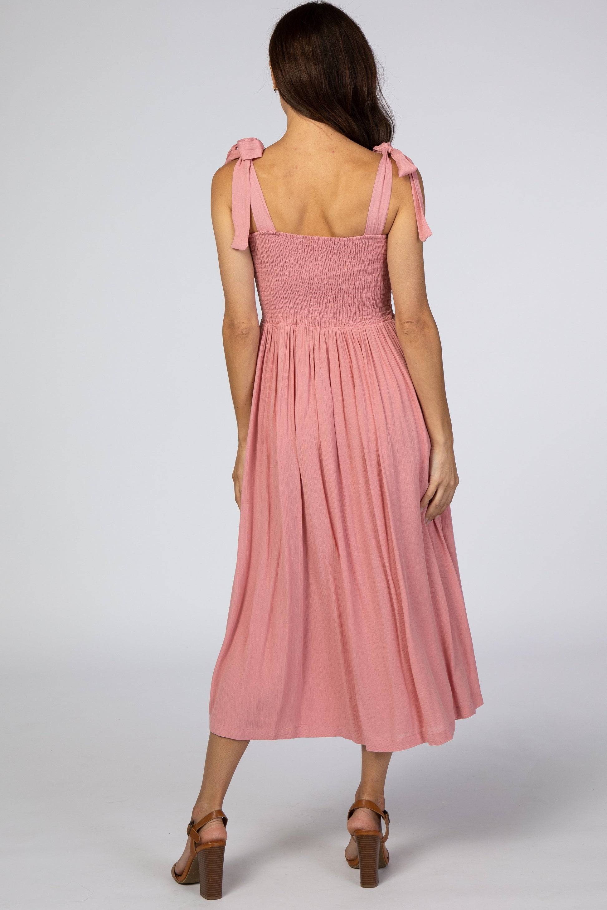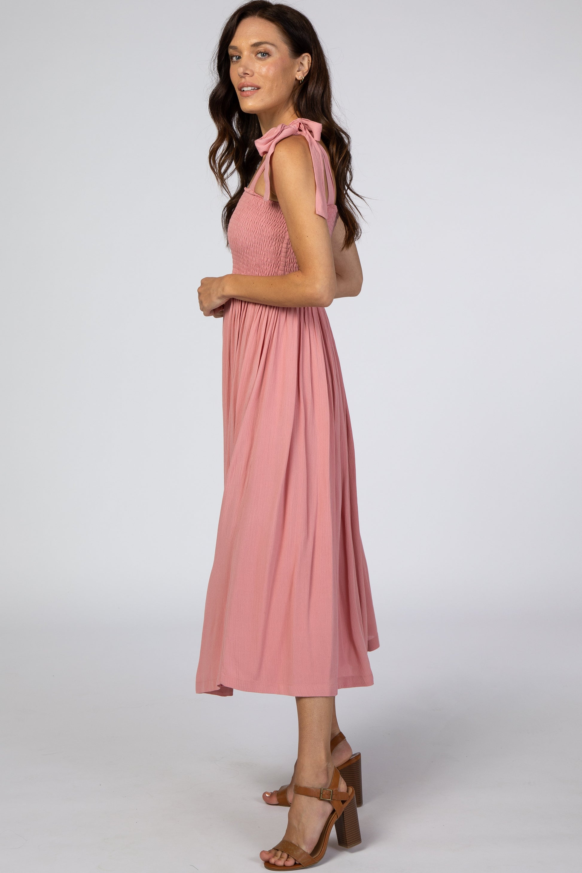 A solid midi dress. Features smocked bust and adjustable self tie straps. Skirt is lined.