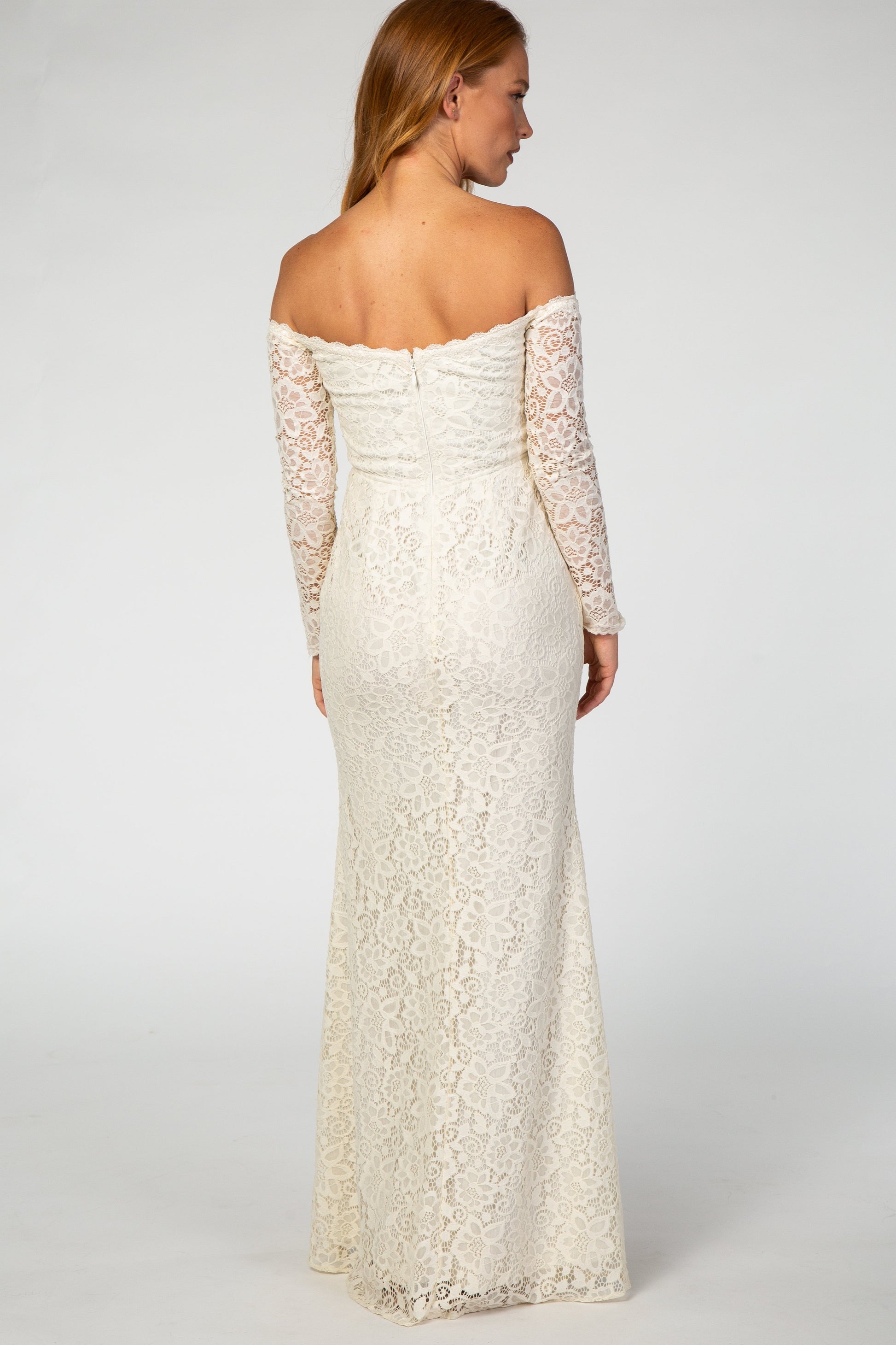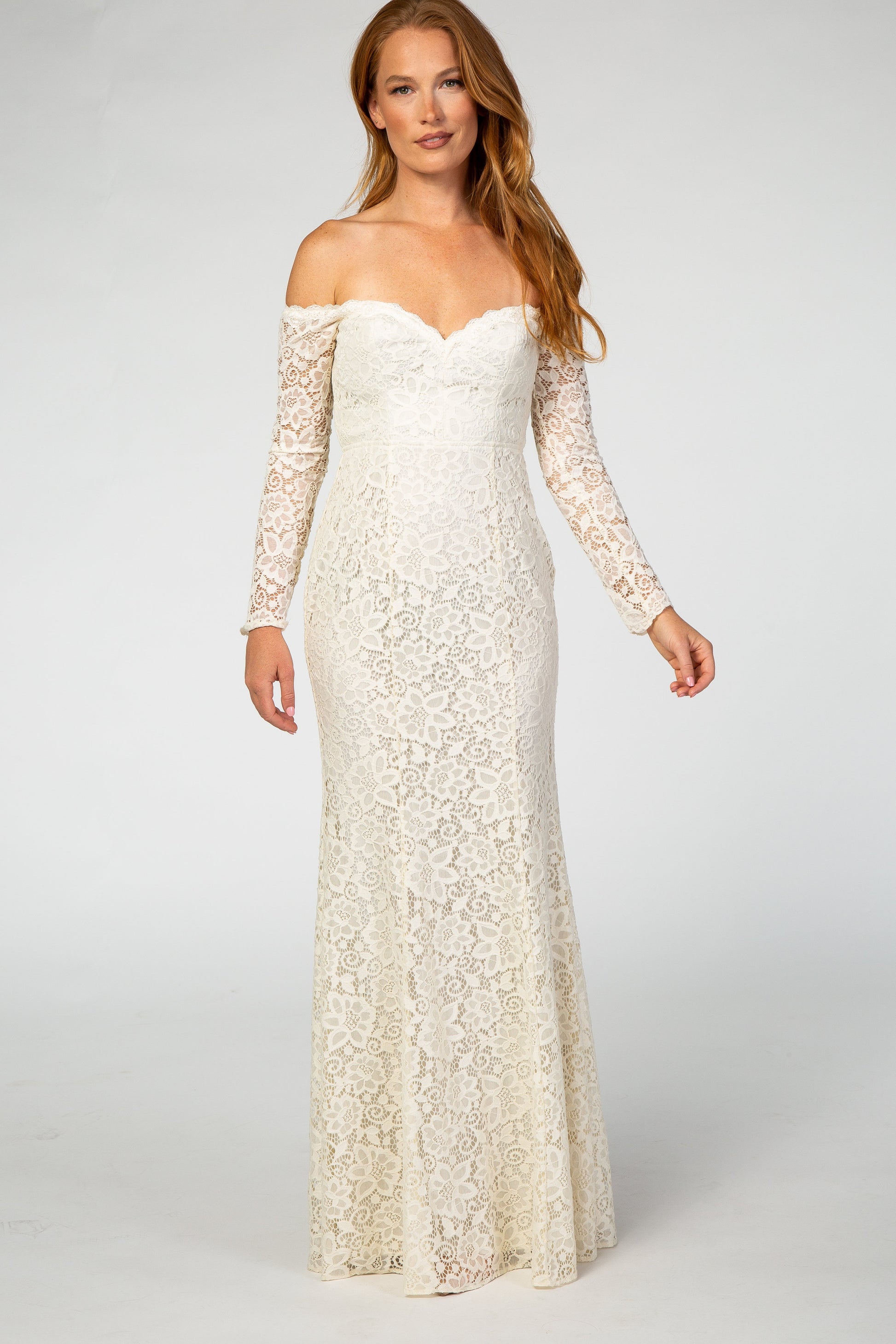 PinkBlush Beige Lace Off Shoulder Long Sleeve Maxi Dress