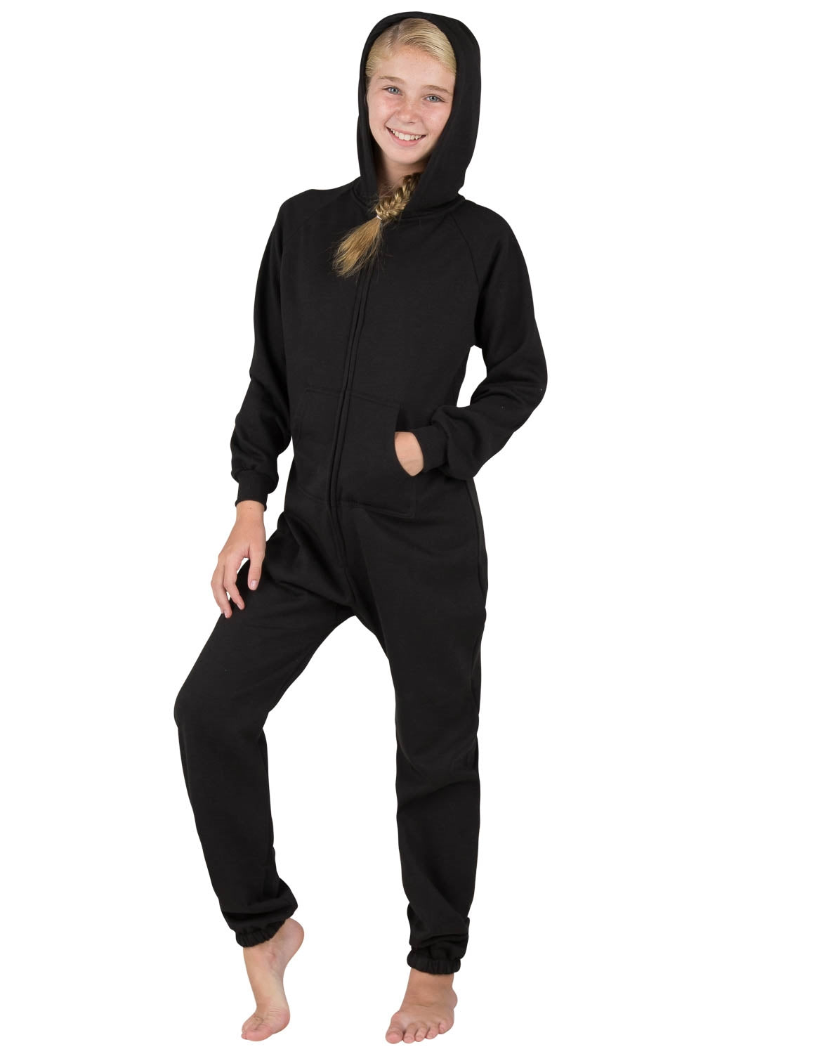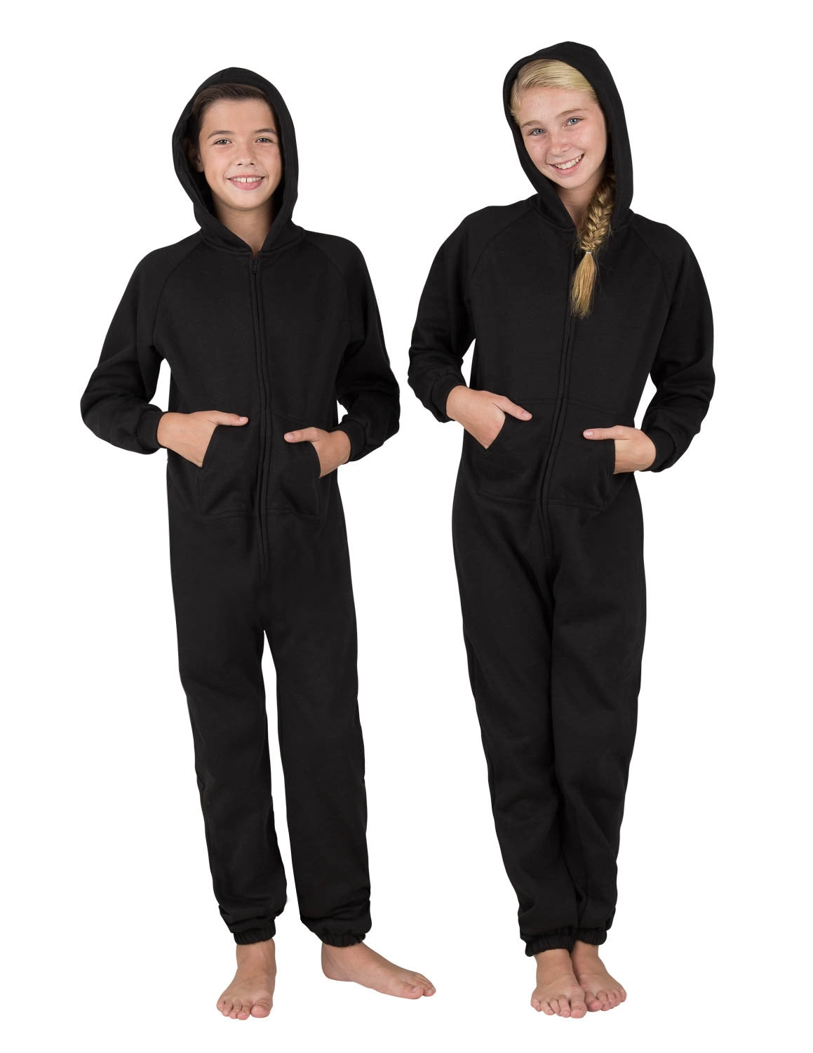 The perfect mix between a track suit and one piece pajamas! Sweat shirt fleece with hoodie’s and front pockets make these joggers extra stylish! Roll out of bed ready for the day! Great for sleeping in and as laid-back outerwear! Both boys and girls will love and look gorgeous in these black footless onesie’s for kids.
