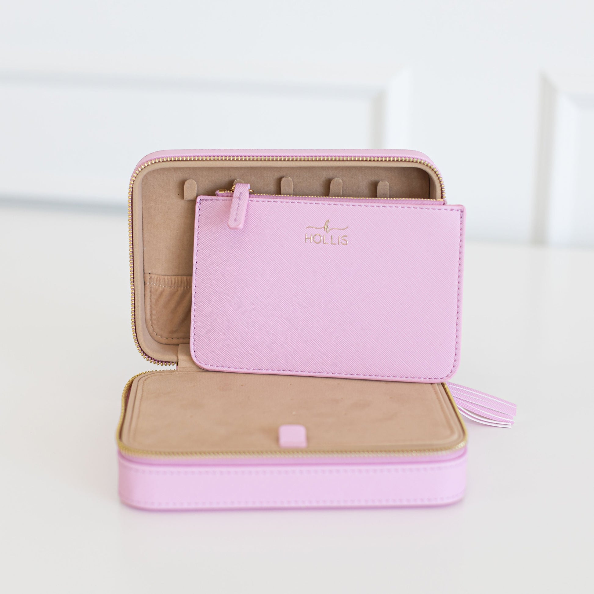 Travel with ease and keep your jewelry organized with our timeless jewelry organizer. Designed to store necklaces, bracelets, earrings, and rings in a display-worthy fashion, this organizer ensures your precious accessories remain tangle-free and protected. Available in our six iconic colors - Leopard, Blush, Nude, Metallic Mocha, Hot Pink, and Pixie Pink - you can select the one that suits your style best. Measuring at 8"x5.5"x2.5", this compact and versatile organizer is the perfect travel companion. Choose functionality and elegance with our jewelry organizer and embark on your next journey worry-free.