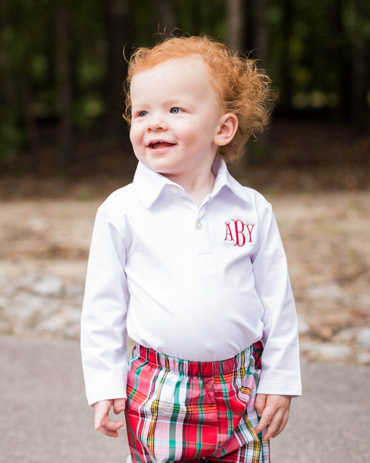 This white polo long sleeve shirt is the perfect addition to anyones wardrobe. This plain white polo collared shirt is perfect to pair with any of our seasonal pants, or by itself as staple shirt to pair with your favorite jeans at home. This soft and stretchy knit is the perfect combination between classic and comfort. Add a monogram or name to the left chest for a perfectly personalized outfit.Â