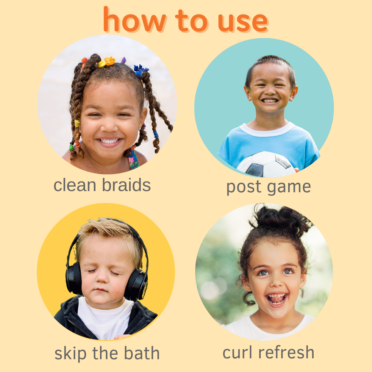 - Hair Refresh: Uses arrowroot powder and activated charcoal to absorb oil and impurities, keeping kids’ hair clean and fresh.