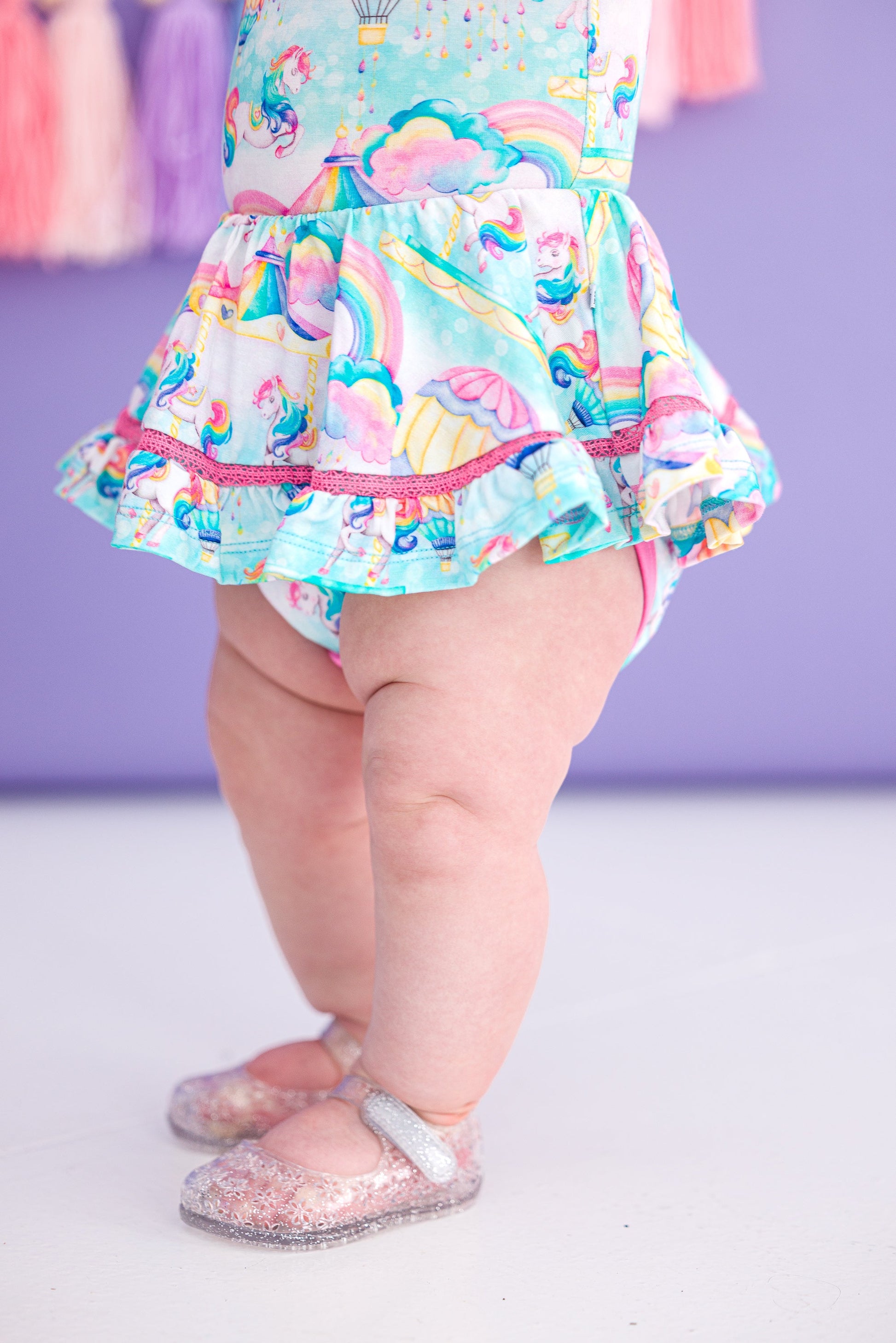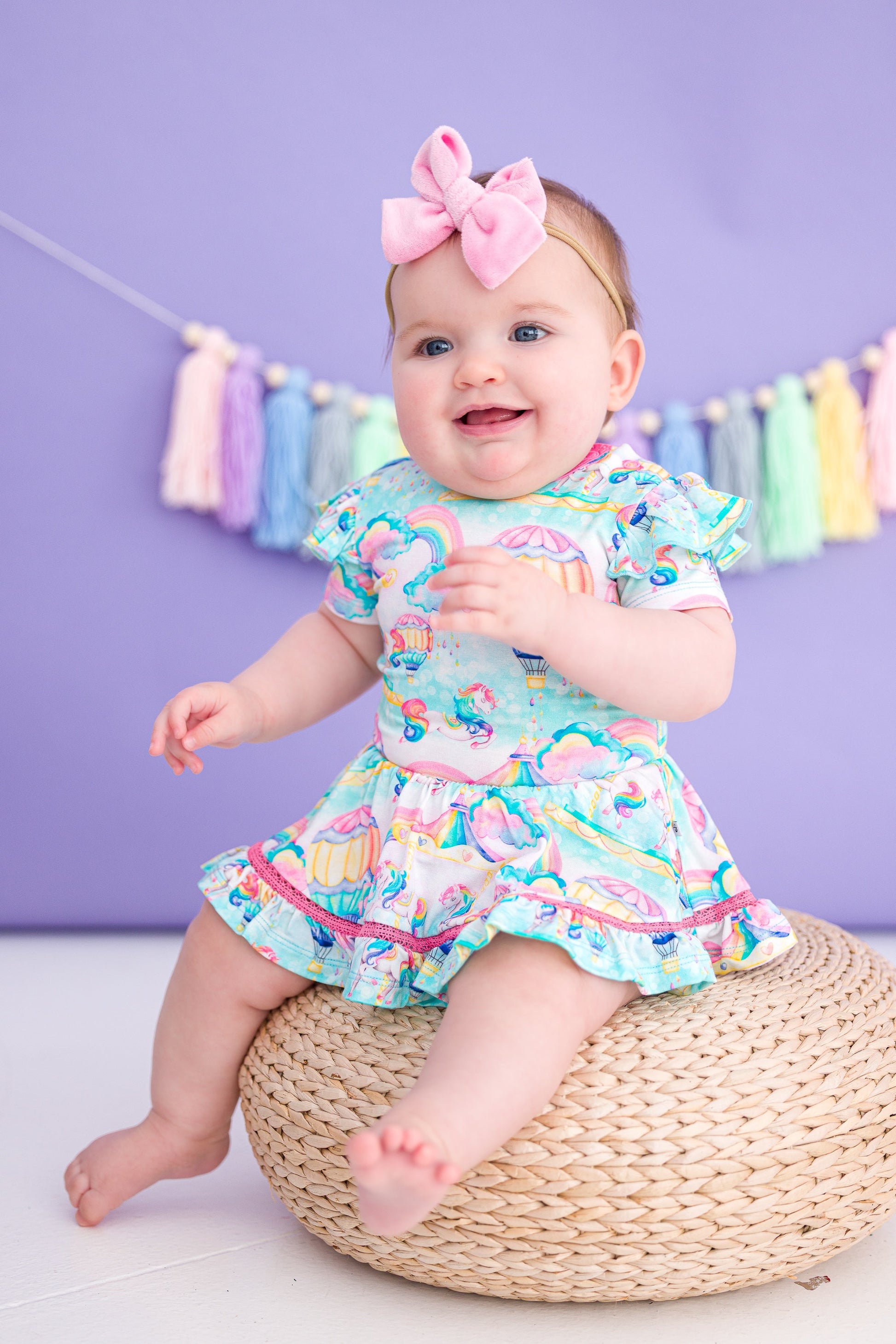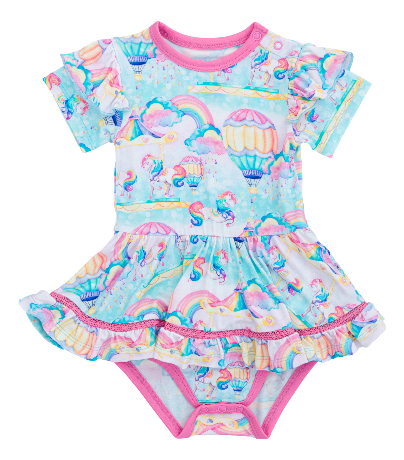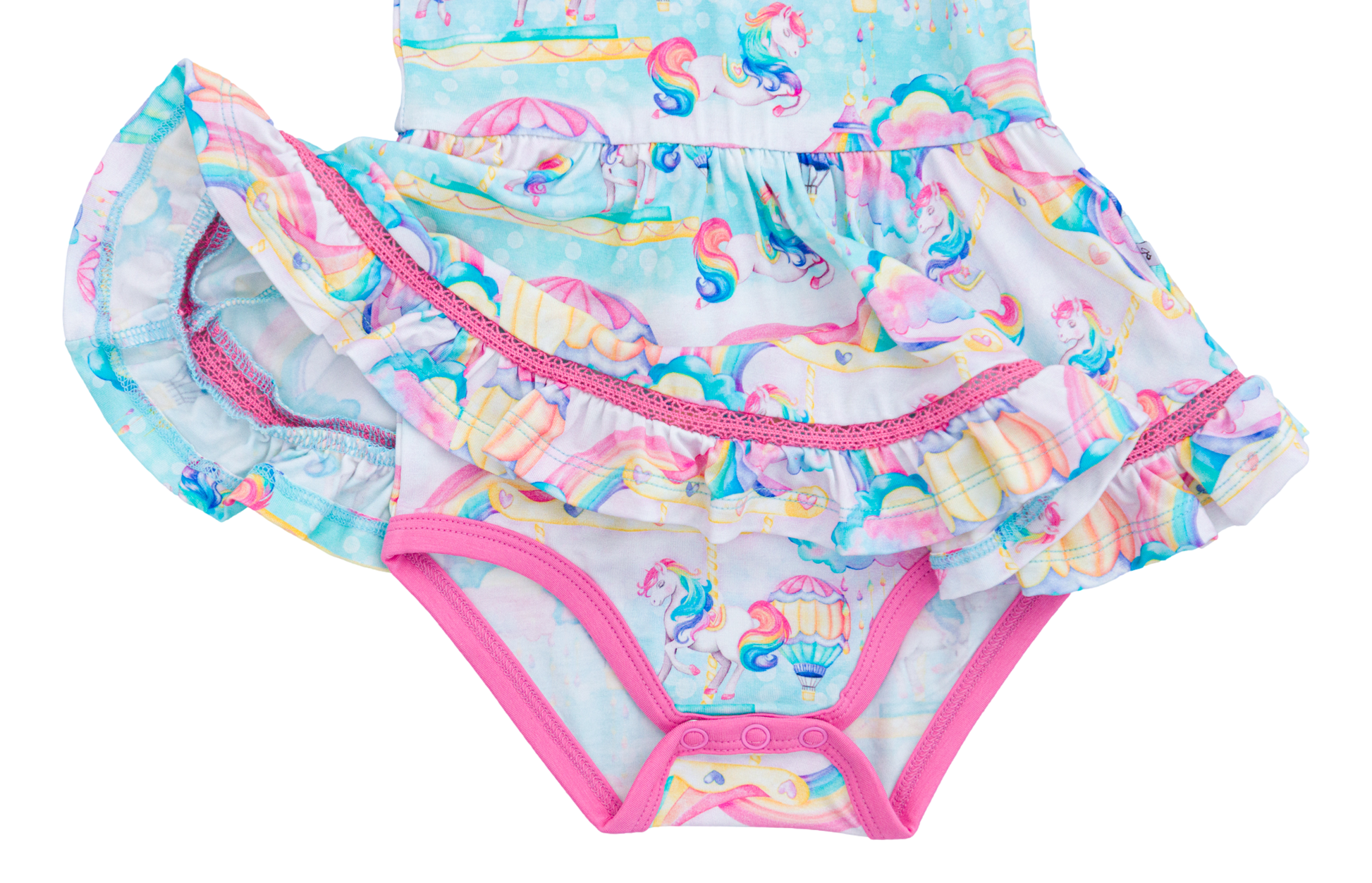 Designed with your little one's comfort and imagination in mind, this whimsical carousel-themed Birdie Twirl is a must-have for playful adventures and special occasions. Made from a luxurious blend of bamboo viscose and spandex, it offers breathability and stretch for the perfect fit. The buttery-soft fabric ensures all-day comfort, while the enchanting carousel design brings a touch of magic to their wardrobe.
