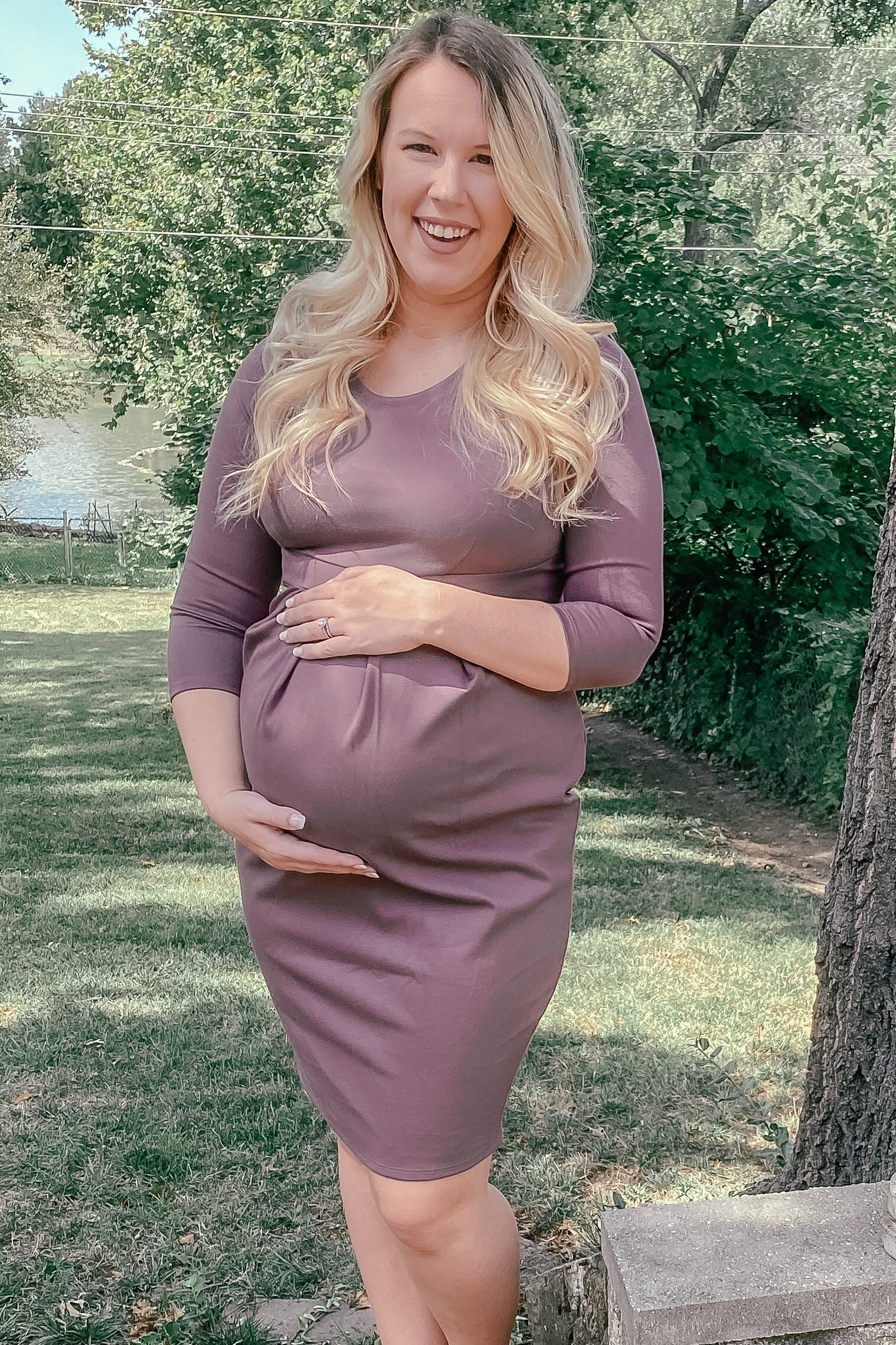 A 3/4 sleeves, round neck and front pleat maternity dress.