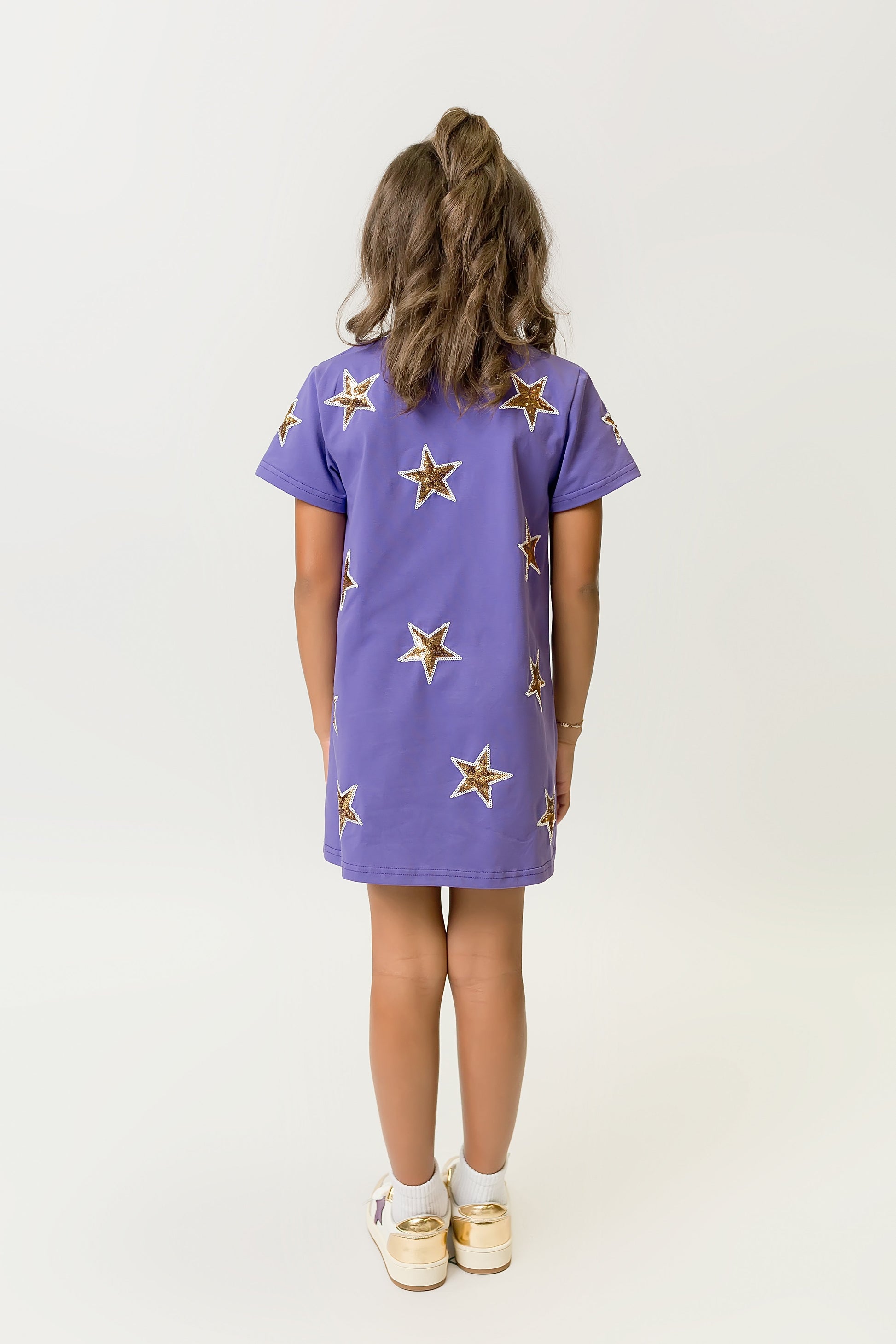 Brighten any day with the playful Purple and Gold Star Dress! Its sparkling star pattern and vibrant colors make it perfect for twirling, dancing, and standing out. Comfortable and lightweight, this dress lets you shine with every step and adds a fun pop to your wardrobe.