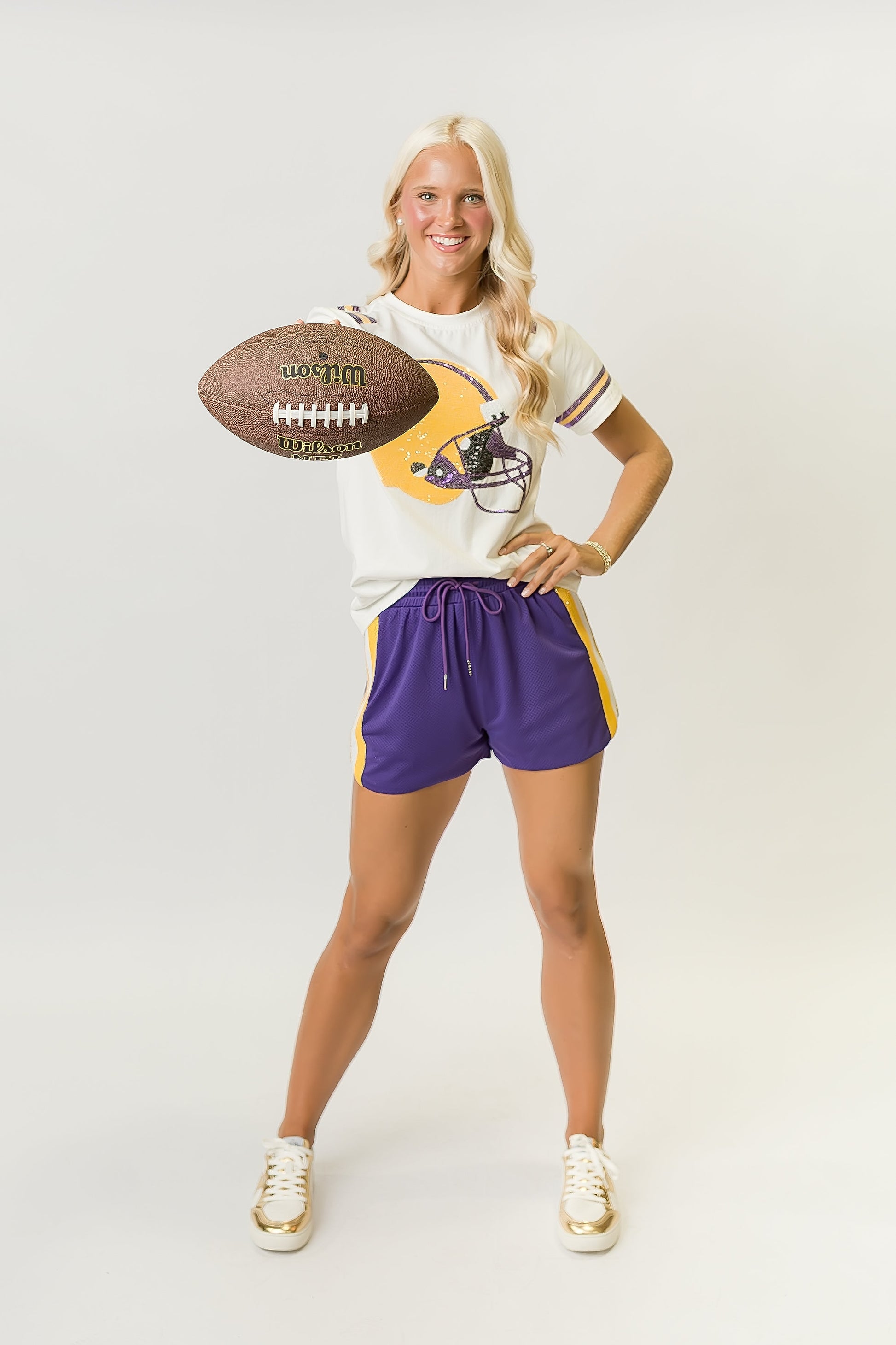 Bring some playful flair to your outfit with the Purple and Yellow Helmet Shirt! Featuring bright, contrasting colors, this shirt adds a fun and sporty touch to your look. Perfect for casual days or making a bold statement, it’s a cheerful way to express your vibrant personality. Comfortable and lively, it’s sure to brighten up any wardrobe.