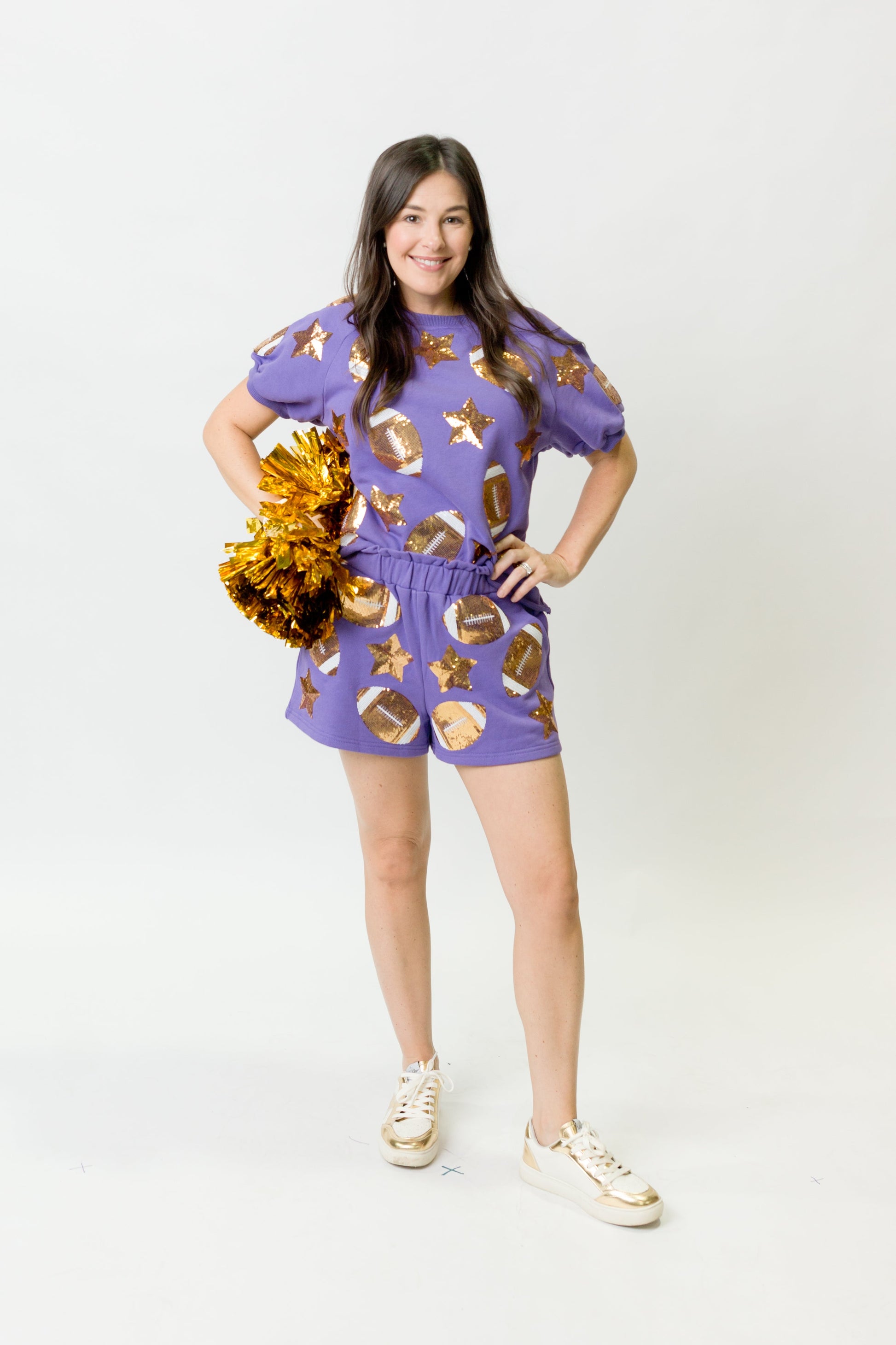 Bring the fun to your sporty style with these Purple Football Sequin Shorts. Covered in shimmering sequins, they add a playful sparkle to your outfit while keeping you comfortable and ready to celebrate every touchdown. Perfect for game day or any time you want to shine bright and stand out!