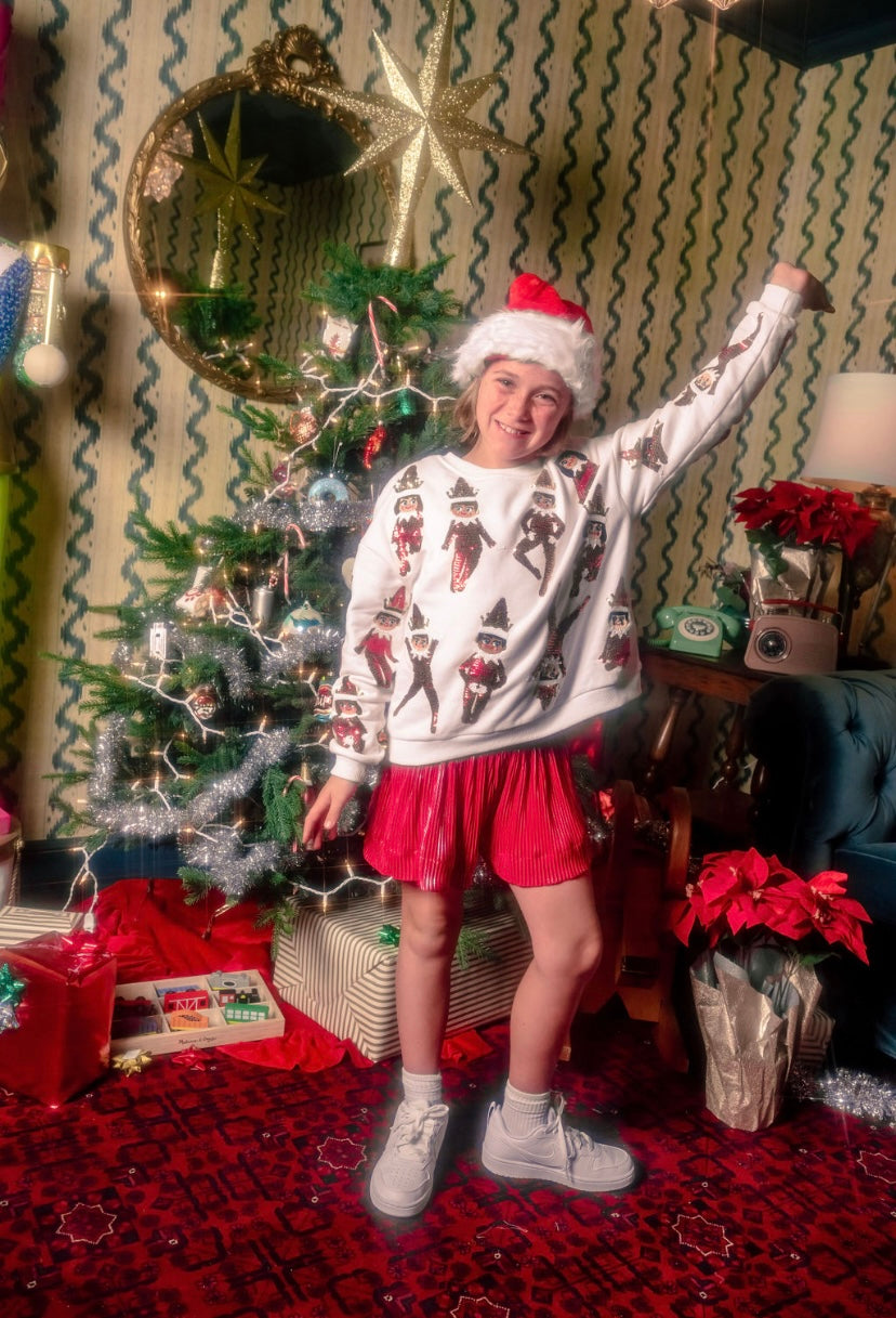 Make the holidays extra magical with our Kids White Elf on the Shelf Sweatshirt! 🎄✨ Covered in sparkling sequined elves with crowns, this festive white sweatshirt is perfect for Christmas celebrations, school holiday parties, family photos, or cozy everyday wear. The playful design brings sparkle and cheer, while the soft, relaxed fit keeps kids comfortable all season long.