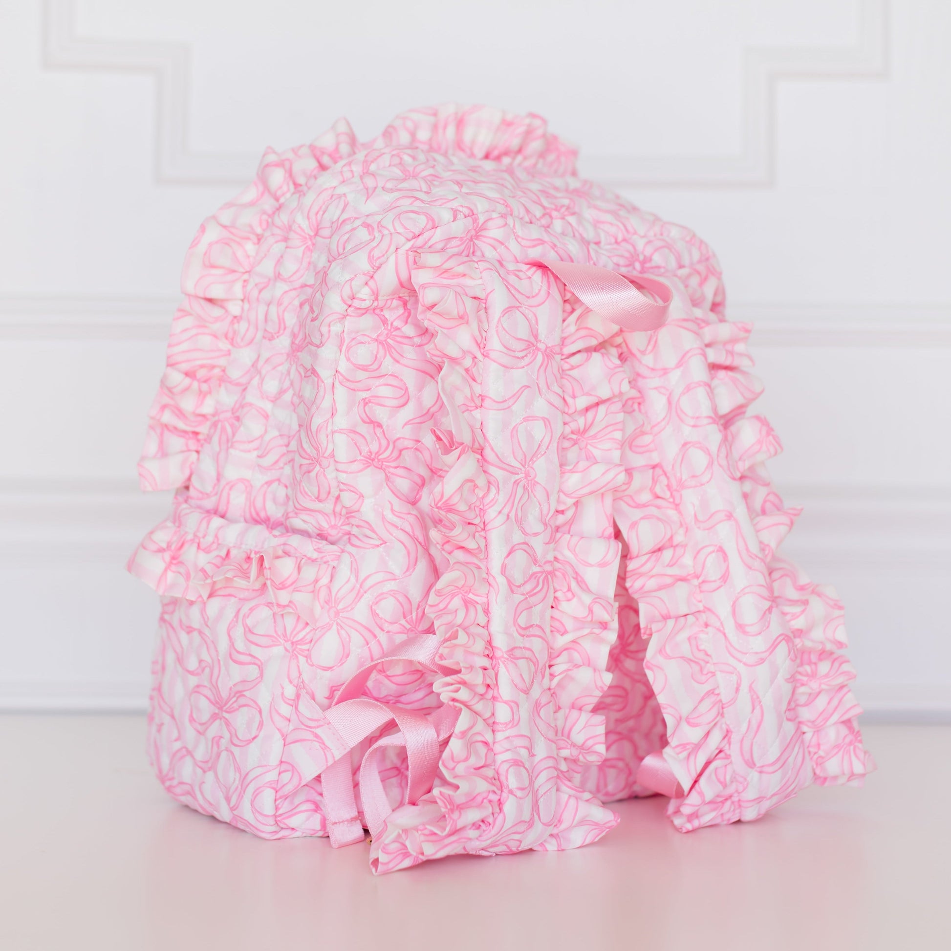 Ruffled trimming along the edges adds the dreamiest texture, while the front is finished with a plush stitched bow for that signature bow-on-bow moment. The spacious interior fits your daily essentials, and the adjustable straps let you carry it comfortably.