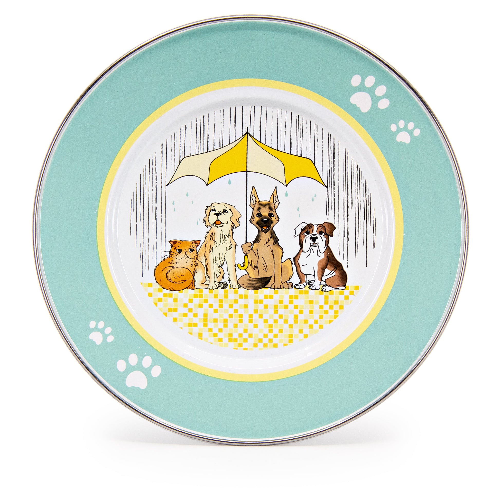 Let the fun rain down at the dinner table with this set of four "Raining Cats and Dogs" plates. With cute, hand-painted illustrations of playful pets in a gentle downpour, these enamel plates are perfect for animal lovers. Durable and whimsical, they add a touch of joy to any meal.
