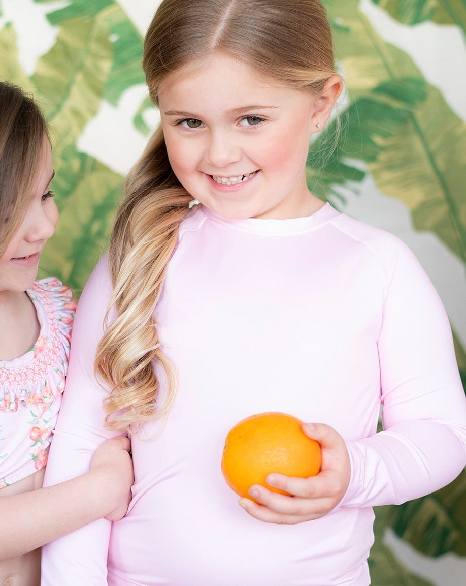 Our Rash Guard Long Sleeve in Pale Pink provides excellent protection and warmth. This water wear is made of compact knitted fabric that guards your child from the sun's rays, the cold, and scratching. Add a personal touch with a name or monogram. UPF50+