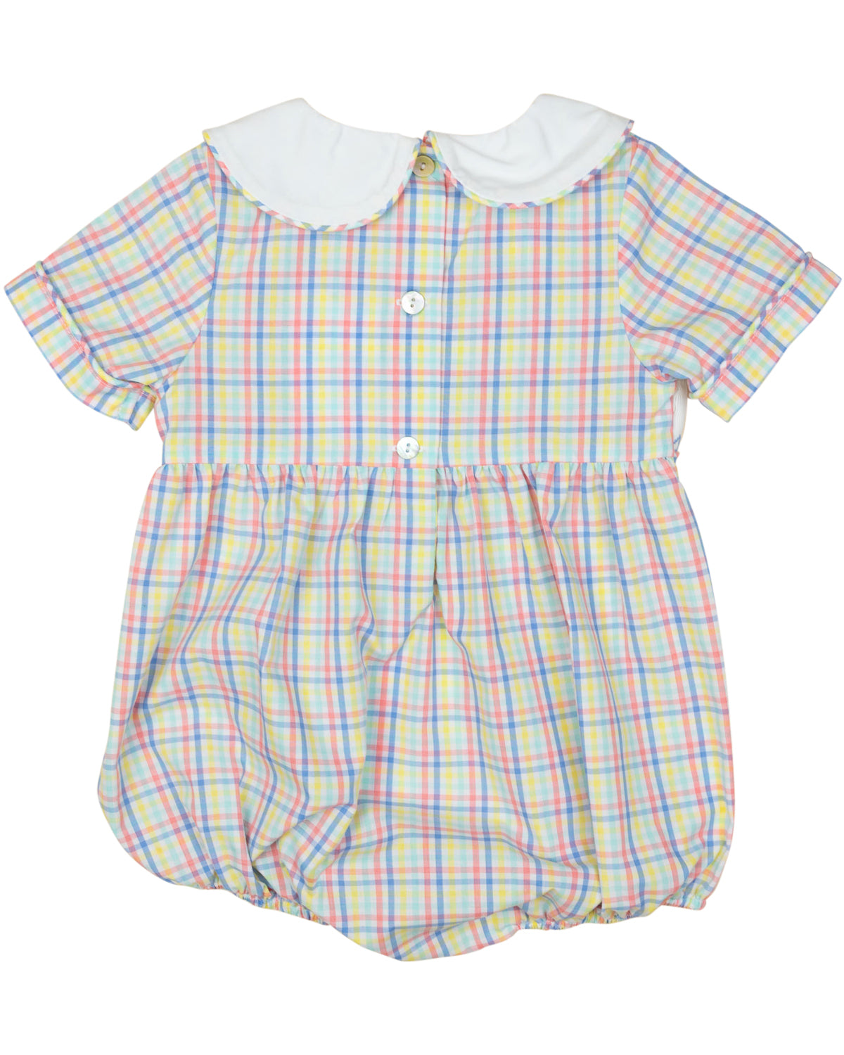 Keep it classic with our Ready to Run Smocked Boy Bubble, featuring a tailored design and a charming horse-themed smocked panel. The pastel plaid fabric pairs beautifully with a crisp Peter Pan collar and snap closures for easy dressing. A perfect match with the Ready to Run Smocked Dress, this piece is ideal for coordinating sibling outfits and photo-worthy moments.