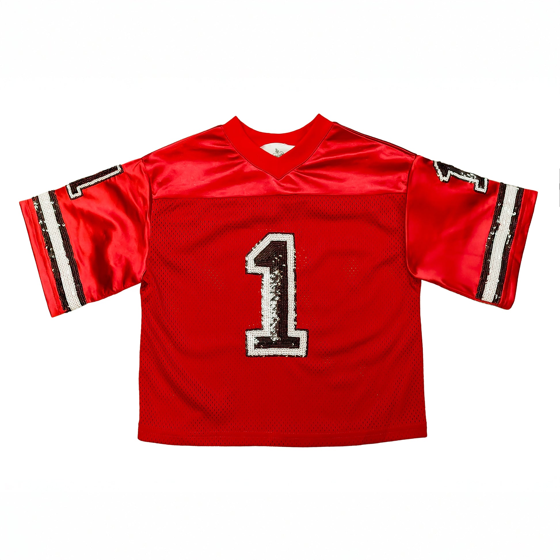 Turn heads with this Red and Black Sequin Jersey, where bold color meets dazzling sparkle. Perfect for adding a playful pop to any outfit, its shimmering sequins catch the light with every move.