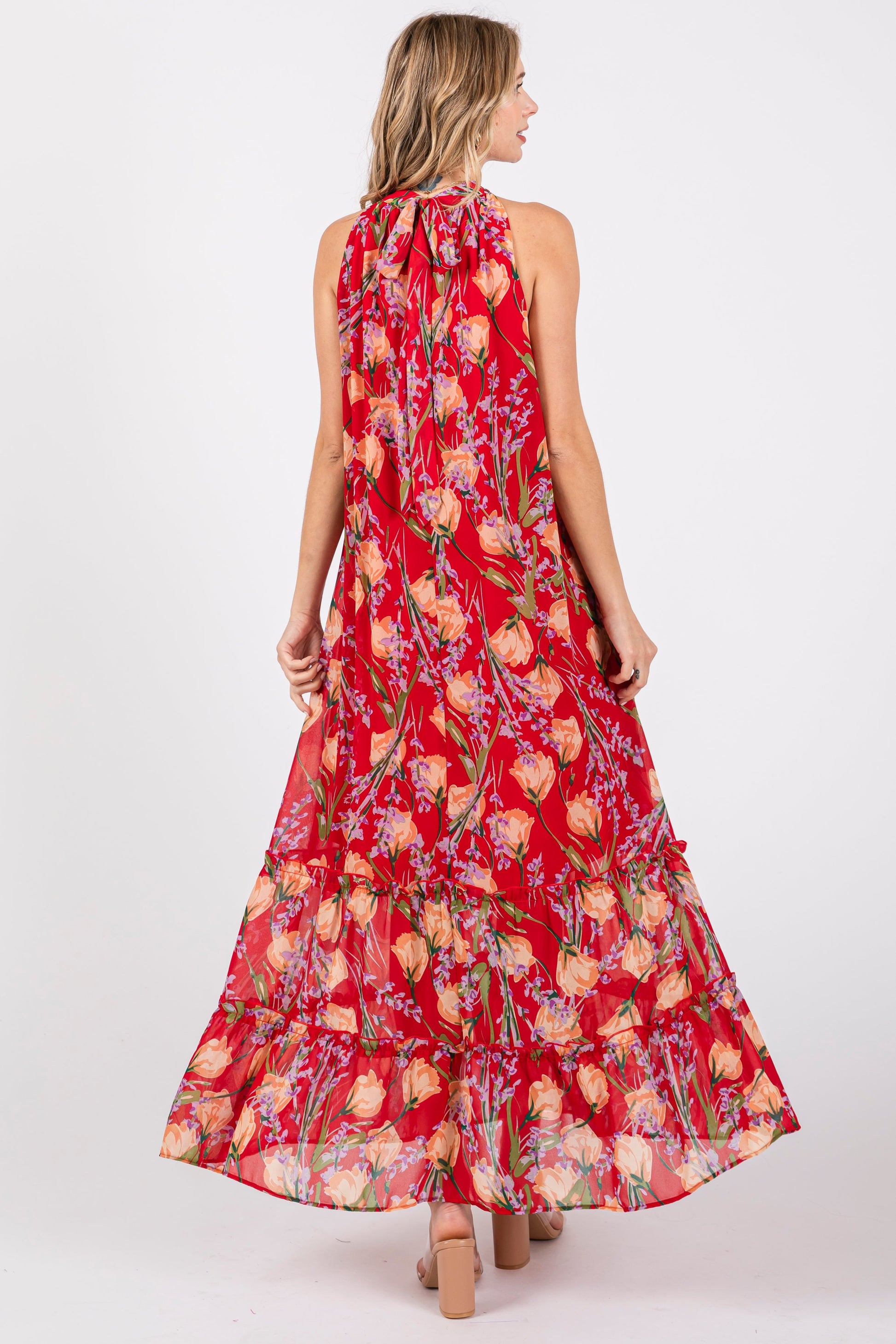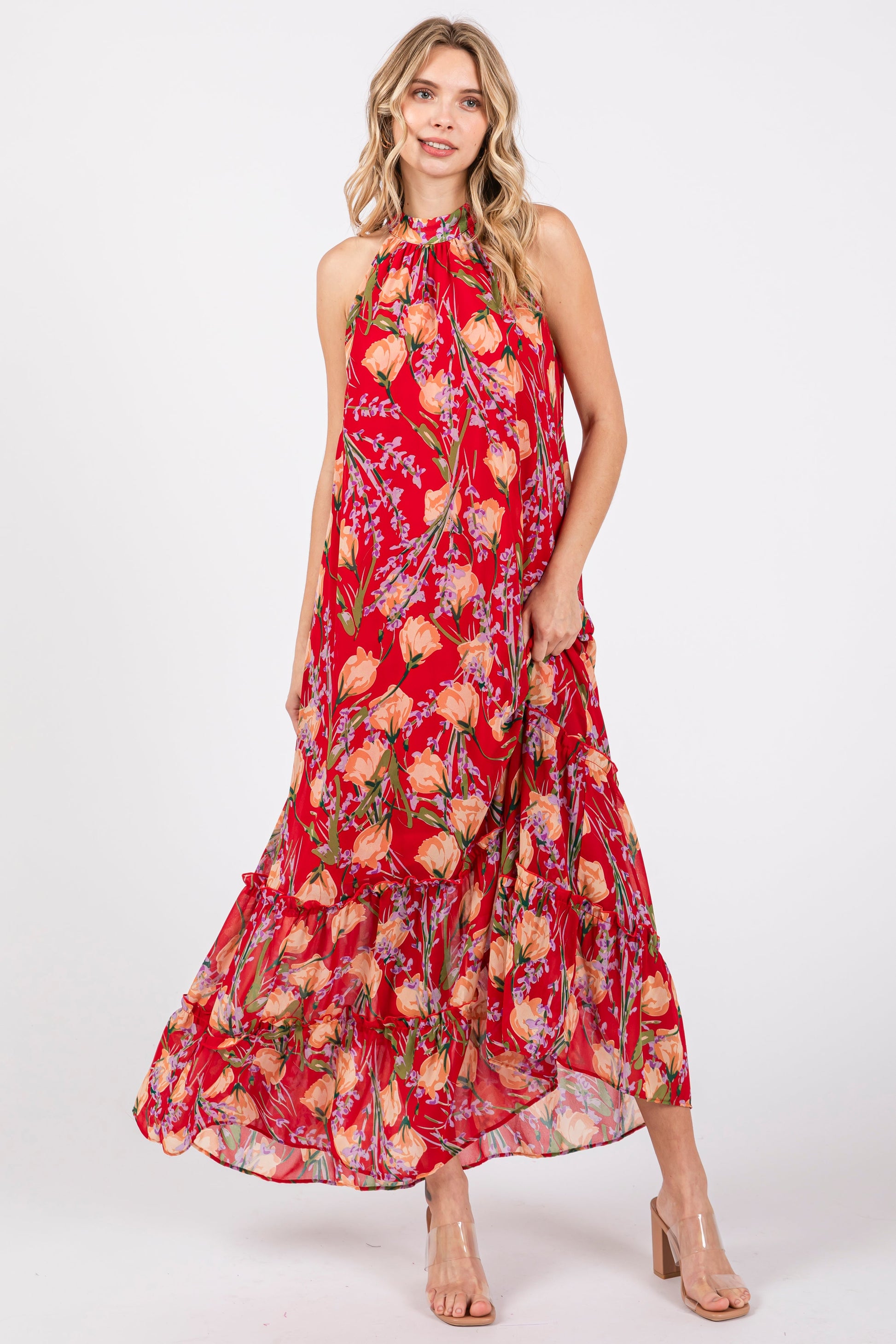 A floral maxi featuring a halter neckline, a back tie closure, and a ruffle accent gathered bottom tier.
