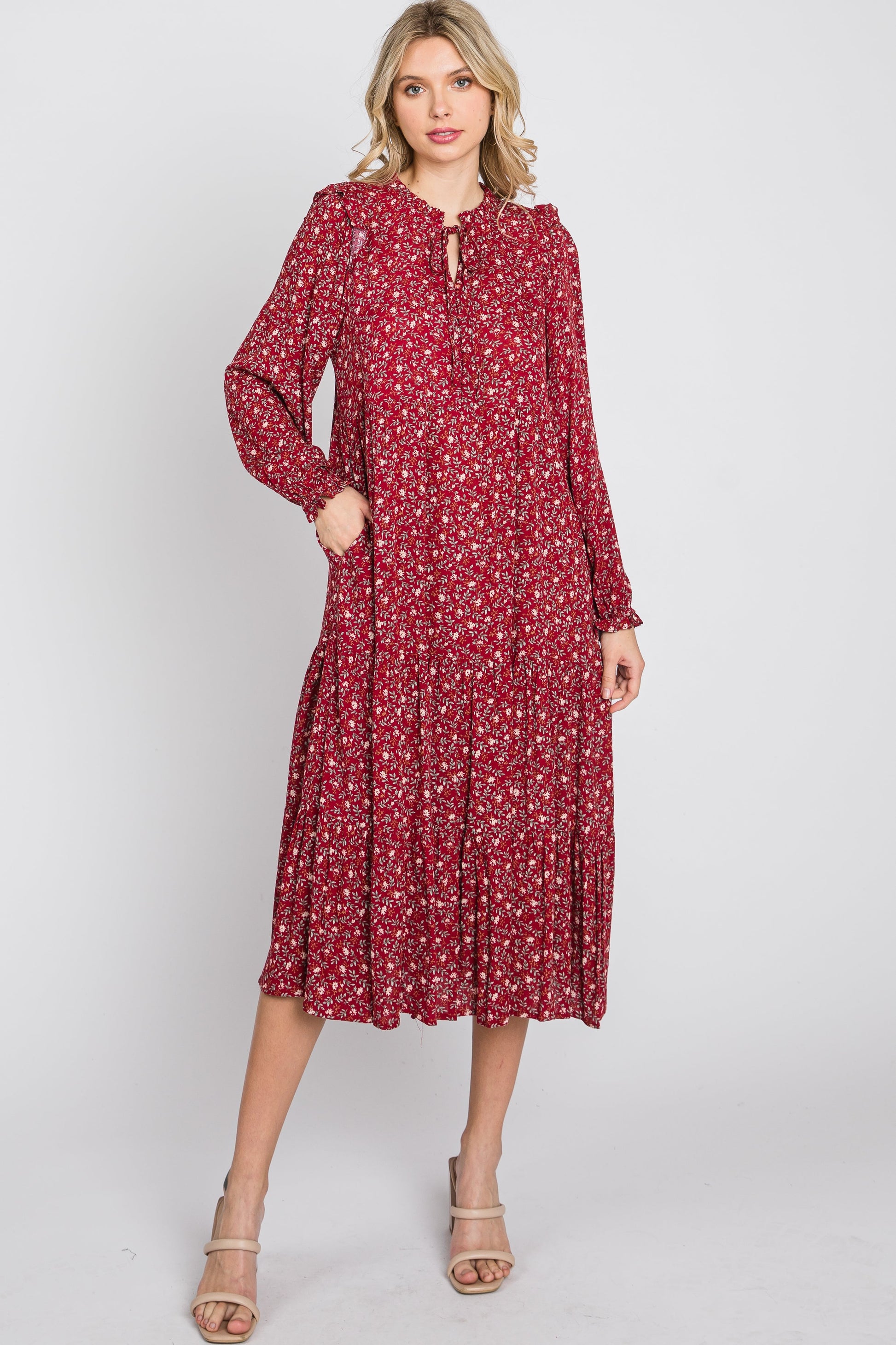 A floral print midi dress with long cinched sleeves, a tiered body, and a tie front/front button closure. Features ruffle accents at the shoulder and around the neckline.