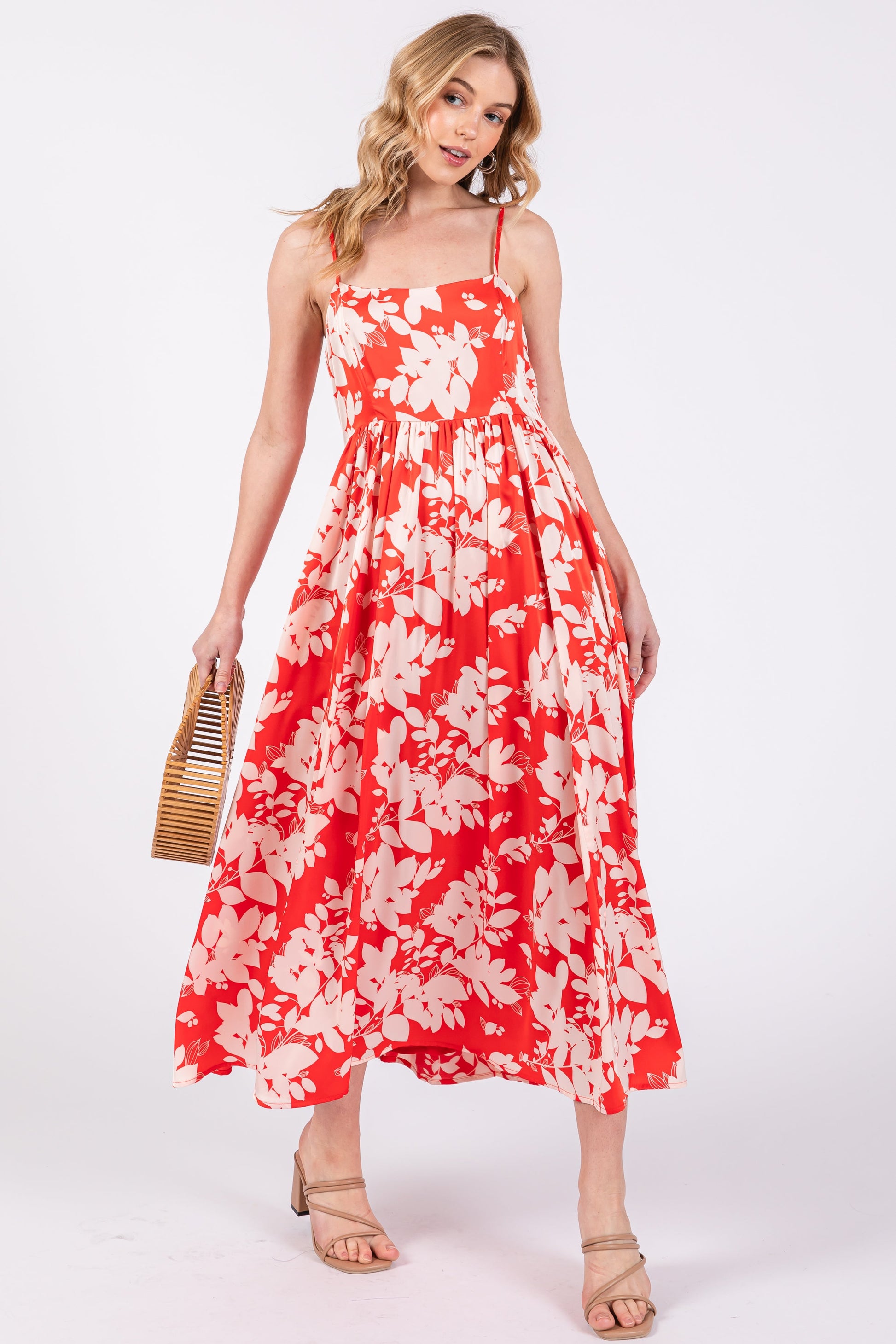 A satin leaf print midi dress featuring a square neckline, adjustable cami straps, a back zipper, an empire waist and double lining.