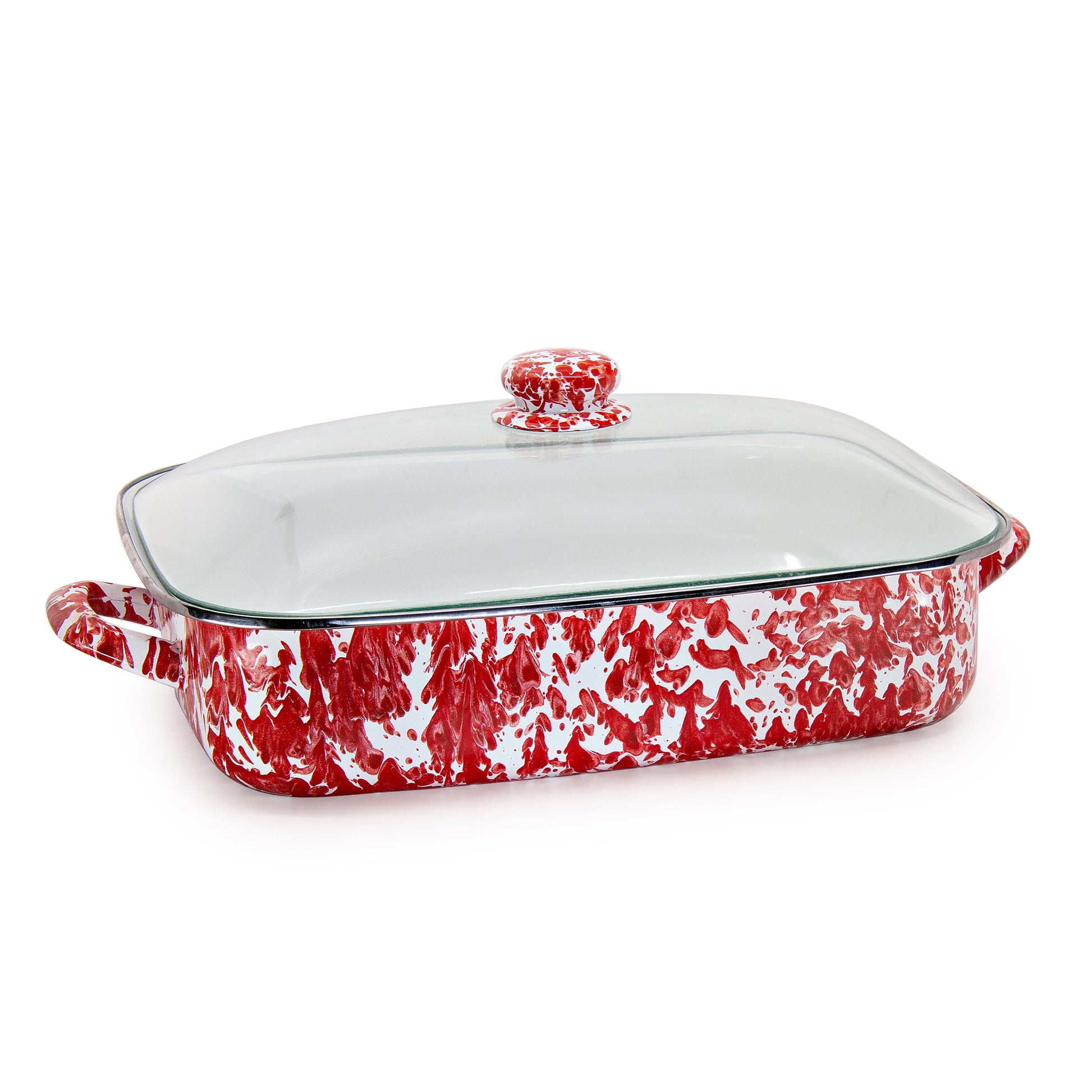 Make a bold statement in the kitchen with the Red Swirl Roasting Pan. Featuring striking red swirls, this enamelware pan is perfect for roasting, baking, or serving your favorite meals. Its durable design and easy-to-clean surface make it as practical as it is stylish.