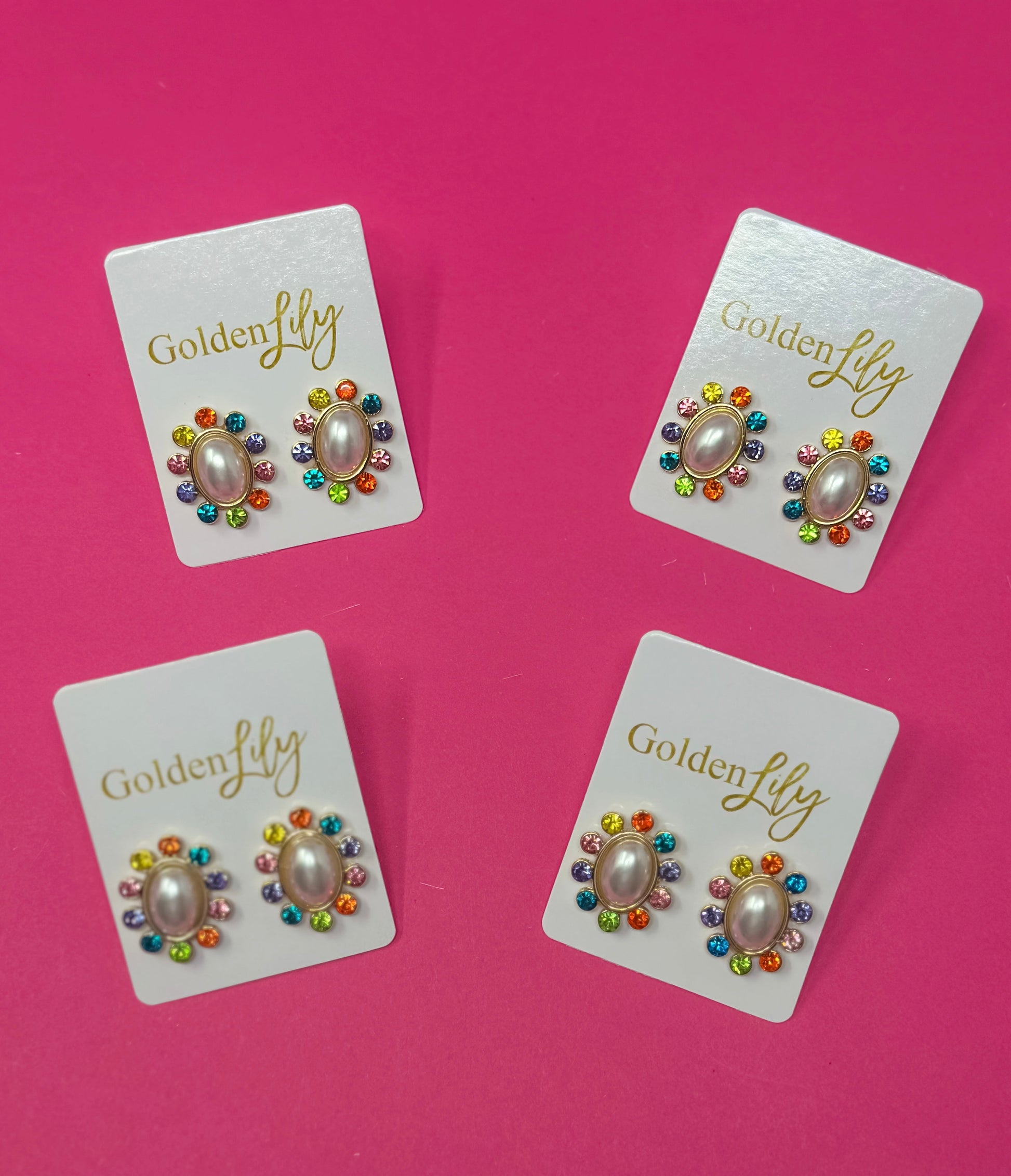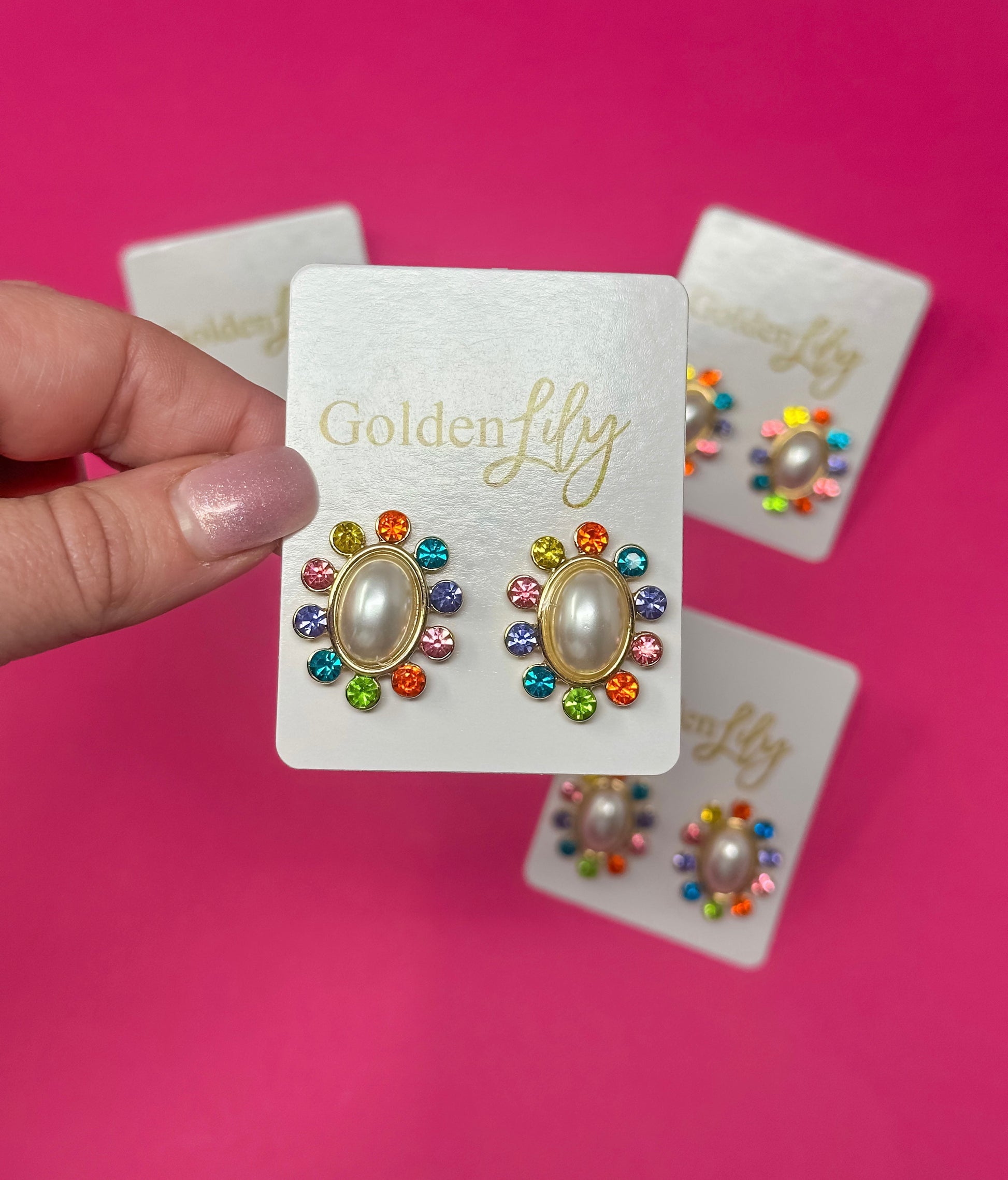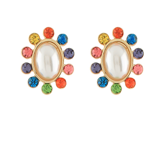 These rhinestone and pearl stud earrings are such a fun pair to wear daily. Embellished with multi rhinestone detail and statement pearl in the center.