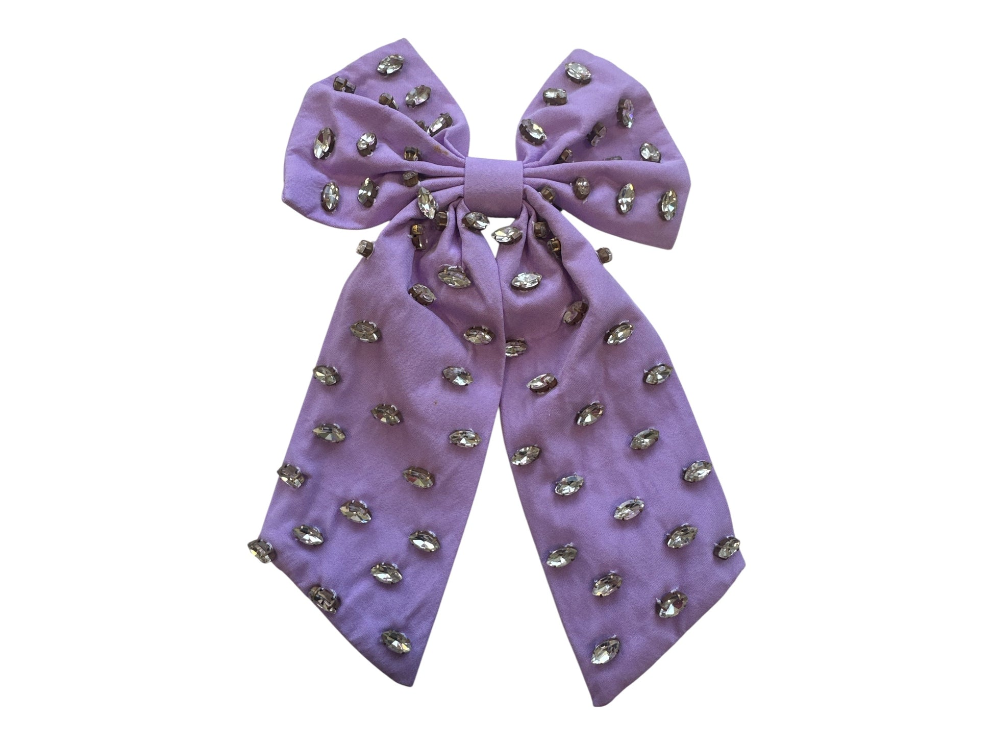 Add a touch of sparkle and elegance to any look with this stunning lavender rhinestone bow. Crafted with shimmering rhinestones that catch the light from every angle, this bow combines feminine charm with glamorous flair. Perfect for game days, parties, or dressing up your everyday style, it makes a chic statement whether worn in your hair, on a bag, or as a standout accessory.