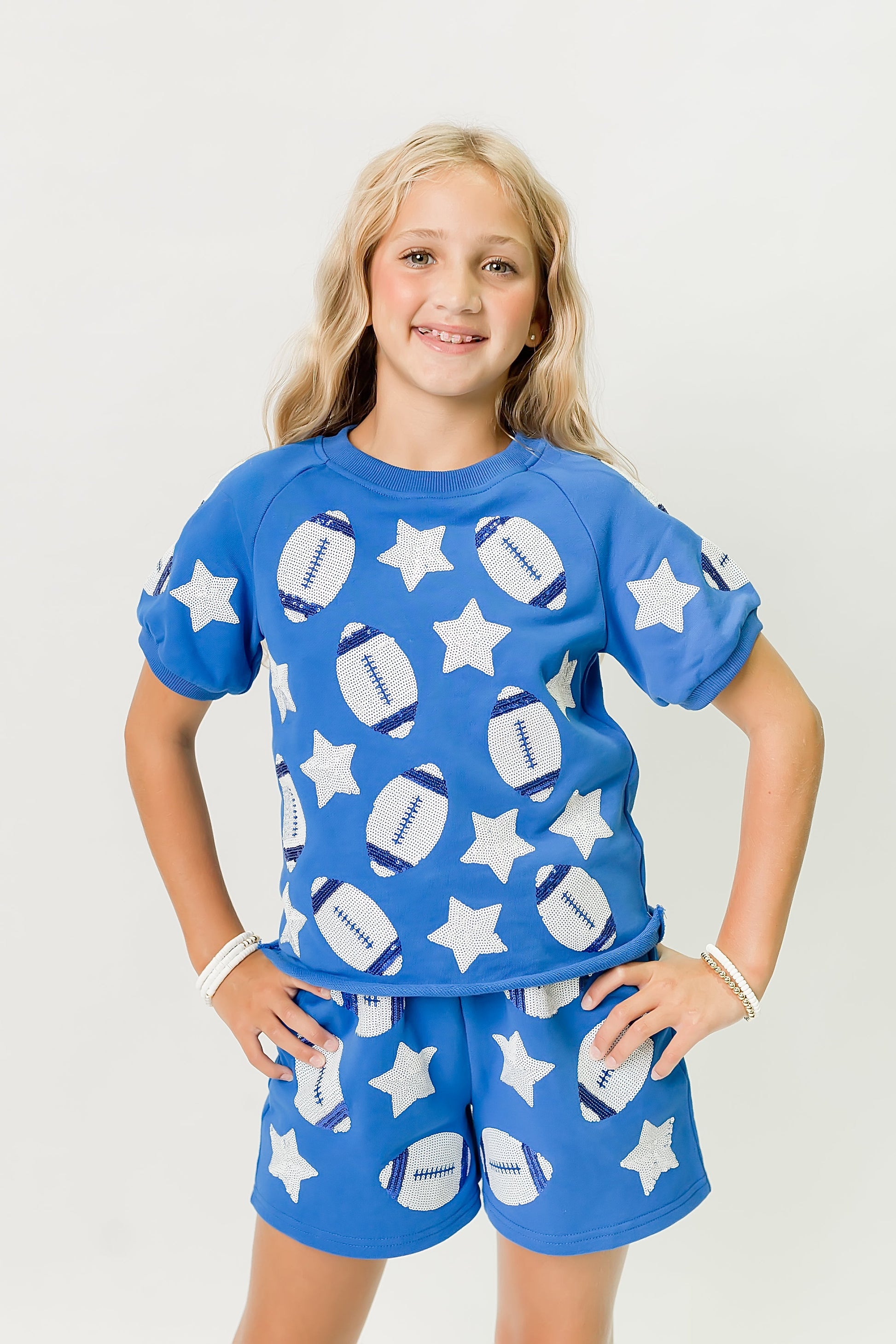 Get ready to shine on and off the field with this Royal Blue Football Top! Covered in sparkling sequins, it brings a playful twist to sporty style. Perfect for showing your team spirit with a dazzling edge, this top combines comfort and sparkle for a standout look.